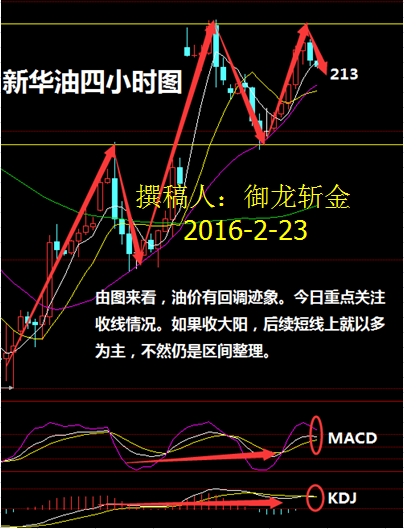 【消息面】 周一(2月22日)是WTI美原油3月期貨合約換月的日子,成交量上升,油價(jià)也隨之波動(dòng)。受美國石油鉆井?dāng)?shù)目減少及俄羅斯官員講話影響,美油暴漲5%。同時(shí),IEA最新報(bào)告預(yù)計(jì)油市將在2017年恢復(fù)平衡。國際能源署預(yù)計(jì)今明兩年美國頁巖油產(chǎn)量將下降,加之全球股市普遍上漲提振投資者樂觀情緒,刺激油價(jià)上漲,此外上周美國石油鉆井?dāng)?shù)量下降,也為今日油價(jià)上漲提供了部分支撐。上周周末發(fā)布的美國至2月19日當(dāng)周石油鉆井總數(shù)錄得減少26口至413口,少于預(yù)期的439口。美國油服貝克休斯表示,因開采支出減少,石油鉆井?dāng)?shù)目進(jìn)一步下滑,這是美國鉆井總數(shù)連續(xù)第九周下滑,刷新六年低位。 周一銅市在多頭買盤作用下繼續(xù)反彈。其中,滬銅4月合約本日收盤上漲430,收于36350元。總持倉增加17548手到73.8萬手。總成交量為60.2萬手。國內(nèi)股市繼續(xù)高開高走并站上2900點(diǎn),有色板塊今日也整體表現(xiàn)較強(qiáng),鋅價(jià)領(lǐng)漲整個(gè)有色板塊,鉛、鎳等金屬也表現(xiàn)不俗,銅價(jià)亦受到周邊市場帶動(dòng)。現(xiàn)貨市場上,今日現(xiàn)貨貼水收窄5元,為貼220元-貼130元,貿(mào)易商和中間商仍維持買貨換貨,但仍不敵市場貨源充足,下游企業(yè)入市量仍較少,市場成交一般,主流成交仍在貿(mào)易商之間。終端需求方面,今年浙江省投資80億元對城市和農(nóng)村電網(wǎng)進(jìn)行改造,本輪電網(wǎng)升級工程,主要新建和改造110千伏及以下配電網(wǎng)。目前,所有工程都已開工,并力爭今年7月底全部完成,配電網(wǎng)需求增加部分彌補(bǔ)銅終端需求的不足。 【2.23新華油行情分析】 昨日早盤高開高走,油價(jià)一路攀升,歐盤時(shí)段突破前期215阻力位后稍作休整,于美盤開盤前半個(gè)小時(shí)再度發(fā)力,至美盤開盤后最高價(jià)220.52,隨后開始震蕩回落,截止收盤價(jià)在217附近。日線圖上,MA5上穿MA20均線,承壓MA60均線,同時(shí)MA10拐頭向上,終結(jié)兩連陽形態(tài)。MACD紅柱再度放量,快慢線仍為金叉后的發(fā)散上行,KDJ指標(biāo)也快速進(jìn)入高位區(qū)。4小時(shí)圖上,均線系統(tǒng)均拐頭向上,油價(jià)站上MA5均線上方,MA10和MA20形成交叉粘合。油價(jià)再度進(jìn)入前期給出的215-223的區(qū)間震蕩區(qū)域,布林帶開始縮口。MACD綠柱縮量有轉(zhuǎn)紅跡象,快慢線粘合后走平,KDJ指標(biāo)高位區(qū)形成拐頭。小時(shí)圖,短期均線系統(tǒng)開始拐頭向下,油價(jià)承壓MA10均線,MACD紅柱是縮量的,快線拐頭向下,KDJ指標(biāo)在高位區(qū)形成死叉后向下。御龍斬金綜合來看,油價(jià)仍存在上行空間,然而短期上漲能量不足,短期會(huì)出現(xiàn)回調(diào)。特別強(qiáng)調(diào)一點(diǎn),油價(jià)并沒有出現(xiàn)反轉(zhuǎn),還沒有到抄底的時(shí)候。前面說過,大環(huán)境的下跌,反彈只是需求,也是對空頭形態(tài)的技術(shù)性修復(fù)。原油供給持續(xù)過剩,在減產(chǎn)協(xié)議沒有達(dá)成之前,任何反彈都只是曇花一現(xiàn),隨之而來的必然是空頭的更猛烈回歸,預(yù)計(jì)今天油價(jià)震蕩回落,上方關(guān)注223阻力的破位情況,下方短期支撐213,第二支撐205. 【2.23新華油操作策略】 1、223空單進(jìn)場,225補(bǔ)倉,止損226,目標(biāo)216 2、205多單進(jìn)場,203補(bǔ)倉,止損202,目標(biāo)213 3、意外上破228,回調(diào)223做多,止損220,目標(biāo)230 4、下破200反彈203進(jìn)空,止損206,目標(biāo)197-198 5、以上原油行情分析及操作策略是以新華油為準(zhǔn),其它交易平臺在線指導(dǎo)請咨詢筆者御龍斬金。 【2.23新華銅行情分析】 走勢上銅和油相近,同樣是高開高走形態(tài),區(qū)別在于歐美盤時(shí)段。銅價(jià)于歐盤前達(dá)到最高,隨后開始小區(qū)間震蕩修復(fù)。日線圖上,為反轉(zhuǎn)十字星的光腳陽柱形態(tài),MACD紅柱放量,快慢線金叉后發(fā)散向上,KDJ指標(biāo)金叉后上行。4小時(shí)圖上,均線系統(tǒng)向上,MACD紅柱縮量,KDJ指標(biāo)進(jìn)入高位區(qū)后出現(xiàn)拐頭。小時(shí)圖上,MACD綠柱放量,快慢線死叉后向下運(yùn)行。綜合來看,短期上漲動(dòng)能不足,空頭更為強(qiáng)勁。威信添加朋友搜索國際金融投資分析師公眾號獲取詳情操作信息。空頭為主 【2.23新華銅操作策略】 1、30600進(jìn)空,止損30800,目標(biāo)30300 2、30200進(jìn)多,止損30000,目標(biāo)30500 3、以上銅行情分析及操作策略是以新華銅為準(zhǔn),其它交易平臺在線指導(dǎo)請咨詢筆者御龍斬金。 亂市悠悠,隨波逐流而后嗚呼哀哉!不謀全局者不足謀一域,市場風(fēng)云,變幻莫測,定其心,觀其勢,謀定而后動(dòng),不亂于心,不困于情,運(yùn)籌帷幄之中,方能決勝千里之外。弱水三千,只取一瓢,取己所需,不貪婪,不好戰(zhàn),收放自如,穩(wěn)操勝券。臉上的胭脂難掩內(nèi)心的寂寞,不是別人不懂你的心,而是你自身的修養(yǎng)不夠。懷疑能過濾風(fēng)險(xiǎn),但也同樣能錯(cuò)失機(jī)會(huì),要想抓住機(jī)會(huì),就要勇于嘗試。對人生的態(tài)度不同,得到的結(jié)果也就不同,若胸?zé)o大志,縱使貴人相助,也終將是扶不上墻的阿斗。千難萬難都是不是困難,一個(gè)投資者的成功史其實(shí)就是一部學(xué)習(xí)成長史。一路艱辛一路