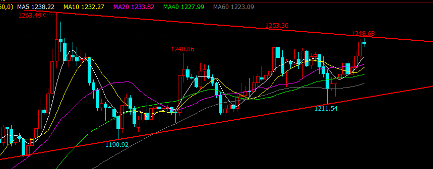綜上所述:目前行情依舊處于三角形區(qū)間震蕩,抵達(dá)了上軌邊沿,向上破位則將順勢突破1253測試前期高點(diǎn)1263,且有突破的可能,重新見到1300;不能破位,則將掉頭向下,重新考驗(yàn)三角形下軌和5周線1220一線的支撐,等待價(jià)格重新選擇方向。