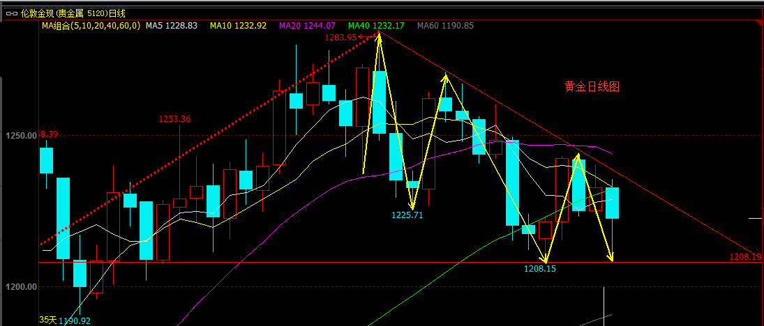 當(dāng)前大方向,價格一直在趨勢線下方震蕩式下跌,高點(diǎn)不斷降低,低點(diǎn)不斷下移,整體思路上繼續(xù)保持看空不變,震蕩式下跌,而不是單邊下跌,下方1190是必須要見到的。下方重要的分水嶺是1208,價格維持在1208上方,則行情將是震蕩,向上突破1235,并順勢突破1245,則有望到達(dá)1260,但月線上來看,并不看好價格直接突破1283。價格下方跌破1208,則行情將進(jìn)一步看空,價格將跌到我說的1190位置,若破位1190,則將到達(dá)1046上升到1283的0.50位置1165和0.618位置1136。