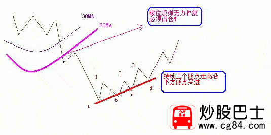 在隨后的時(shí)間里,必須耐心等待股票見底,比如圖一表明的,出現(xiàn)持續(xù)三個(gè)低點(diǎn)走高,可以沿下方低點(diǎn)買回前期清倉(cāng)籌碼。A-D點(diǎn)都是買回的機(jī)會(huì),不過(guò)前兩個(gè)低點(diǎn)只能夠試探買進(jìn),畢竟探底趨勢(shì)還在進(jìn)行,以防再次下行。 一般這樣的方法可以賺取前期更多的籌碼,扭虧解套不需要等到前期賣出位置,就能夠?qū)崿F(xiàn)。 第二種:邊打邊撤法。 個(gè)股跌破趨勢(shì)支撐線后,一般會(huì)有技術(shù)反彈,但是,第一次反彈無(wú)法收復(fù)前期上升趨勢(shì)線,即,圖二中的粉紅色線,則不要幻想是挖坑洗盤了,這個(gè)時(shí)候,股票還會(huì)進(jìn)行新一輪下跌,圖二中的1-2位置都是高拋點(diǎn)。 這樣的情況下操作,一般只會(huì)有小幅虧損,絕對(duì)不會(huì)深套和重虧。 在大勢(shì)向壞的情況下,能夠少虧就是賺,就是贏,這為下一波行情的到來(lái)保留了足夠的實(shí)力。