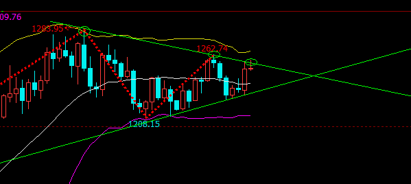 今日早間亞盤開盤后,黃金延續昨天的走勢,再次沖高,最高到達1258.12。小幅刺破1283、1262日線下降趨勢線和昨天高點1257聯合壓力,目前價格交投于1253附近。