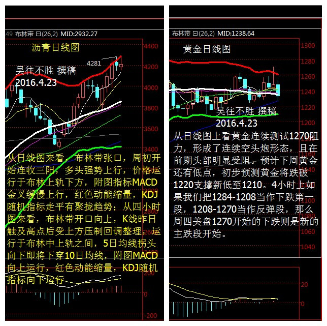 吳往不勝 4.23 周評 現(xiàn)貨黃金 現(xiàn)貨瀝青下周行情解析 【4.23 下周開盤操作建議】 寧貴瀝青操作建議 4140-4150一線做多 止損40個點(diǎn) 看到4200-4240 4250-4260一線做空,止損40個點(diǎn) 看到4200-4180 現(xiàn)貨黃金操作建議 上方關(guān)注1242-1244一線輕倉做空 止損4美元 目標(biāo)看到1233-1228 下方關(guān)注1213-1215一線做多 損4美元 目標(biāo)看到1240-1245 【技術(shù)面分析指導(dǎo)】 現(xiàn)貨瀝青(寧貴瀝青)分析 布倫特原油收漲1.3%,報每桶45.11美元,美國原油收漲1.3%,報每桶43.73美元。布倫特和美國原油盤中一度跳漲多至3%。本周布倫特原油漲4.5%,美元原油升8.4%,兩者皆錄得連續(xù)第三周上漲。油價較1月和2月期間觸及的低位反彈了逾三分之二。 回顧本周行情,由于多哈凍產(chǎn)會議未能達(dá)成任何有效協(xié)議,以及合約切換的影響,寧貴瀝青大幅低開,可以令人意想不到的是,開盤沒有多久,多頭就開始回補(bǔ)缺口。后面也是一路震蕩上行,從周一最低3755漲到了最高4281,今早凌晨收盤于4191,可謂漲勢喜人。從日線圖來看,布林帶張口,周初開始連收三陽,多頭強(qiáng)勢上行,價格運(yùn)行于布林上軌下方,附圖指標(biāo)MACD金叉緩慢上行,紅色動能縮量,KDJ隨機(jī)指標(biāo)走平有聚攏趨勢;從四小時圖來看,布林帶開口向上,K線昨日觸及高點(diǎn)后受上方壓制回調(diào)整理,運(yùn)行于布林中上軌之間,5日均線拐頭向下即將下穿10日均線,附圖MACD向上運(yùn)行,紅色動能縮量,KDJ隨機(jī)指標(biāo)向下運(yùn)行,綜合來看,價格想繼續(xù)上行,需要有一定的回調(diào)修整,因此下周行情吳往不勝認(rèn)為先回調(diào)后上漲。 現(xiàn)貨黃金分析 國際現(xiàn)貨黃金周五(4月22日)亞市早盤開于1247.50美元/盎司后進(jìn)入?yún)^(qū)間盤整,金價小幅波動;在觸及日內(nèi)高點(diǎn)1252.60美元/盎司后,金價小幅盤整下跌。歐市延續(xù)盤整走勢,多空交錯前行,但空方逐漸占優(yōu)。美市金價未能持穩(wěn),小幅反彈后呈跳水狀下跌,多頭挨轟潰不成軍,在觸及日內(nèi)低點(diǎn)1226.96美元/盎司后,金價小幅反彈但仍未持久,終收跌于1231.90美元/盎司的低位。國際現(xiàn)貨黃金周五亞市早盤開于1247.50美元/盎司,最高觸及1252.60美元/盎司,最低下探1226.96美元/盎司,收于1231.90美元/盎司,下跌15.70美元,跌幅為1.26%。 本周行情走了過山車,首先是周一漲到1262,然后跌至1224,周三探底周四拉升至1269,周四美盤暴跌20美金,周五順勢跌至1228!究其原因是因?yàn)辄S金日線與4小時處于震蕩中,上有1270阻力,下有1220支撐。從日線圖上看黃金連續(xù)測試1270阻力,形成了連續(xù)空頭炮形態(tài),且在前期頭部明顯受阻。預(yù)計下周黃金還有低點(diǎn),初步預(yù)測黃金將跌破1220支撐新低至1210。4小時上如果我們把1284-1208當(dāng)作下跌第一段,1208-1270當(dāng)作反彈段,那么周四美盤1270開始的下跌則是新的主跌段開始。這樣劃分,則市場不破1270,短線目標(biāo)是跌破1210,更中線目標(biāo)則是1180!1小時上短線黃金還是跌勢,我們周一的主要交易思路依然是高空:認(rèn)為黃金沒有突破1242多空關(guān)鍵分水嶺與下降趨勢線前,都是應(yīng)該高空。 【消息面導(dǎo)讀】 周五(4月22日)在本周歐洲央行決議之后,市場關(guān)注的焦點(diǎn)就完全轉(zhuǎn)移到下周美聯(lián)4月份決議之上,雖然市場普遍認(rèn)為這次決議美聯(lián)儲不會升息,但近來穩(wěn)健的美國數(shù)據(jù)和中國擔(dān)憂的緩解使得投資者再度尋找美聯(lián)儲最早在6月份加息的線索,這種預(yù)期支撐美元在周五的交投中走高,所有非美品種承壓。原油方面,雖然有跡象限制原油市場供需逐漸轉(zhuǎn)向平衡,但美元指數(shù)的走高限制了油價的升勢,不過本周油價還是在改善的市場環(huán)境中大幅上漲5%。 具體市場上,美元指數(shù)大幅攀升觸及95關(guān)口,市場認(rèn)為下周美聯(lián)儲決議可能釋放鷹派信息;歐元兌美元回落跌至三周低位,受累于疲軟經(jīng)濟(jì)數(shù)據(jù);金價下跌,受美元走強(qiáng)打壓,且日元走軟打壓避險品種;油價小幅上漲1%,市場人氣改善提振油市連升三周。 下周一(4月25日)亞洲時段,投資者首先需要關(guān)注各個品種的開盤跳空的情況,周末可能發(fā)生的重大基本面事件可能會影響各個品種的開盤走勢。此后投資者主要關(guān)注中國市場的表現(xiàn),然后留意日本的領(lǐng)先指標(biāo),近來日本央行擴(kuò)大負(fù)利率范圍的傳言四起,在這樣的背景下,投資者就需要特別關(guān)注日本經(jīng)濟(jì)數(shù)據(jù)的表現(xiàn),從而把握日本央行行動的可能性。 歐洲時段,投資者重點(diǎn)關(guān)注德國的IFO商業(yè)景氣指數(shù),該數(shù)據(jù)可能會對歐元短期走勢產(chǎn)生一定的影響。另外,交易英鎊的投資者應(yīng)該關(guān)注英國的CBI工業(yè)訂單差值,該數(shù)據(jù)一般都能影響英鎊短線的走勢,雖然近來英國退歐的憂慮有所緩和,但在疲弱歐元的帶動下,英鎊能否守住漲幅值得投資者期待。 紐約時段,市場迎來美國數(shù)據(jù)的考驗(yàn),投資者重點(diǎn)關(guān)注美國的新屋銷售,在當(dāng)周美聯(lián)儲決議前美國經(jīng)濟(jì)數(shù)據(jù)的表現(xiàn)值得投資者關(guān)注。 【下周重點(diǎn)關(guān)注】 周一 16:00 德國4月IFO商業(yè)景氣指數(shù) 18:00 英國4月CBI工業(yè)訂