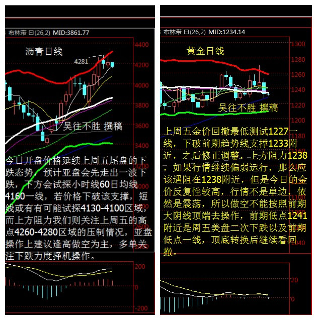 吳往不勝 4.25現(xiàn)貨黃金 現(xiàn)貨瀝青行情解析 【4.25 操作建議】 寧貴瀝青操作建議 4120-4130一線做多 止損40個(gè)點(diǎn) 看到4200-4220 4250-4260一線做空,止損40個(gè)點(diǎn) 看到4200-4180 現(xiàn)貨黃金操作建議 上方關(guān)注1242-1244一線輕倉做空 止損4美元 目標(biāo)看到1233-1228 下方關(guān)注1217-1219一線做多 損4美元 目標(biāo)看到1240-1245 【技術(shù)面分析指導(dǎo)】 現(xiàn)貨瀝青(寧貴瀝青)分析 布倫特上周原油收漲1.3%,報(bào)每桶45.11美元,美國原油收漲1.3%,報(bào)每桶43.73美元。布倫特和美國原油盤中一度跳漲多至3%。本周布倫特原油漲4.5%,美元原油升8.4%,兩者皆錄得連續(xù)第三周上漲。油價(jià)較1月和2月期間觸及的低位反彈了逾三分之二。 回顧上周行情,由于多哈凍產(chǎn)會議未能達(dá)成任何有效協(xié)議,以及合約切換的影響,寧貴瀝青大幅低開,可以令人意想不到的是,開盤沒有多久,多頭就開始回補(bǔ)缺口。后面也是一路震蕩上行,從周一最低3755漲到了最高4281,上周凌晨收盤于4191。今日開盤價(jià)格延續(xù)上周五尾盤的下跌態(tài)勢,預(yù)計(jì)亞盤會先走出一波下跌,下方會試探小時(shí)線60日均線4160一線,若價(jià)格下破該支撐,短線或有有可能試探4130-4100區(qū)域,而上方阻力我們則關(guān)注上周五的高點(diǎn)4260-4280區(qū)域的壓制情況,亞盤操作上建議逢高做空為主,多單關(guān)注下跌力度擇機(jī)操作。 現(xiàn)貨黃金分析 上周五現(xiàn)貨黃金早間開盤1246美元/盎司,白盤最高觸及1252美元/盎司一線,最低觸及1243一線,然后一直維持1242-1250區(qū)間來回整理,尾盤因?yàn)槊乐傅臎_高并逐漸企穩(wěn)導(dǎo)致其下破1242關(guān)鍵性支撐,經(jīng)過橫盤之后一路下跌最低觸及1227一線,日線以中等陰柱報(bào)收,周線報(bào)收一根帶較長上影線的小陰柱。周線級別連續(xù)報(bào)收兩根帶較長上影線的陰柱,說明黃金方面高位存在較強(qiáng)的壓制力,有一定的見頂跡象,但是由于美指浮動較為頻繁,所以本周的利率決議將再度受到矚目,黃金是否再度走弱,本周的走勢將會非常具有指導(dǎo)意義! 上周五金價(jià)回撤最低測試1227一線,下破前期趨勢線支撐1233附近,之后修正調(diào)整,上方阻力1238,如果行情繼續(xù)偏弱運(yùn)行,那么應(yīng)該遇阻在1238附近,但是今日的金價(jià)反復(fù)性較高,行情不是單邊,依然是震蕩,所以做空不能按照前期大陰線頂端去操作,前期低點(diǎn)1241附近是周五美盤二次下跌以及前期低點(diǎn)一線,頂?shù)邹D(zhuǎn)換后繼續(xù)看回撤。 【消息面導(dǎo)讀】 伊朗石油部長上周日(4月24日)表示,上周多哈會議盡管未能達(dá)成凍產(chǎn)協(xié)議,但確有著積極的意義,伊朗支持任何穩(wěn)定油市的做法。 伊朗油長贊加內(nèi)稱,多哈會議未能達(dá)成一致,不過會議旨在促進(jìn)OPEC與非OPEC產(chǎn)油國之間的對話,并向OPEC主要產(chǎn)油國傳達(dá)了一種信息,各方需要共同合作改變目前低油價(jià)的情況。 贊加內(nèi)在德黑蘭與南非能源部長舉行會議,并表示自從一月份撤銷制裁后,伊朗原油產(chǎn)量增加了100萬桶/日。贊加內(nèi)還表示,伊朗將繼續(xù)增加原油產(chǎn)量直到恢復(fù)其在國際原油市場失去的份額。 隨著美國汽油需求觸及歷年3月最高紀(jì)錄,投機(jī)賬戶的西德克薩斯中質(zhì)油(WTI)凈多頭頭寸飆升至去年5月份以來的最高水平;美國期貨交易委員會數(shù)據(jù)顯示,在截至4月19日的一周,基準(zhǔn)美國原油凈多頭增加30,357至245,987張期貨和期權(quán)合約;紐約商交所(Nymex)汽油凈多頭增加15%至23,357張合約,超低硫柴油凈空頭減少11%至7,773張合約 美國6月原油期貨目前跌0.59%至43.49美元/桶;布倫特6月原油目前跌0.27%至45.00美元/桶一線; 美油、布油均處在近五個(gè)月高位,均處在布林帶上軌附近,且年初以來雙底形態(tài)形成后目前均已達(dá)到突破頸線后的第一看漲目標(biāo),本周關(guān)注整固及回落風(fēng)險(xiǎn);多倉或需及時(shí)獲利了結(jié)。 美元指數(shù)本周聚焦美聯(lián)儲決議,具體在周三交易日(北京時(shí)間周四凌晨02:00),雖然美聯(lián)儲4月料不會加息,但6月加息預(yù)期較大,那么需警惕4月暗示6月加息的鷹派言論; 日元本周警惕日本央行新推寬松政策壓制日元升值風(fēng)險(xiǎn),上周五已有消息稱日本央行考慮放貸負(fù)利率政策,日元上周五全線暴跌; 最新CFTC持倉顯示,4月19日止當(dāng)周,日元投機(jī)性凈多頭增加5680手合約,至71870手合約,連續(xù)第二周創(chuàng)至少1992年以來最高水平。 【今日關(guān)注】 16:00 德國4月IFO商業(yè)景氣指數(shù) 18:00 英國4月CBI工業(yè)訂單差值 22:00 美國3月新屋銷售總數(shù)年化(萬戶) 22:30 美國4月達(dá)拉斯聯(lián)儲商業(yè)活動指數(shù) |