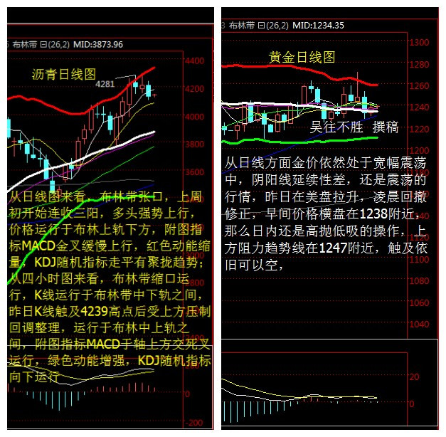吳往不勝 4.26現貨黃金 現貨瀝青行情解析 【4.26 操作建議】 寧貴瀝青操作建議 4190-4200一線做空 止損40個點,看到4130-4110 首次到達4050一線輕倉做多,止損40個點 看到4100-4120 現貨黃金操作建議 1247-1249一線輕倉做空 止損4美元 目標看到1233-1228 1231-1233一線做多 損4美元 目標看到1240-1245 【技術面分析指導】 現貨瀝青(寧貴瀝青)分析 WTI原油6月期貨周一(4月25日)收跌1.09美元,跌幅2.49%,報42.64美元/桶。繼上周油價大漲之后,本周首個交易日,油價表現出高位震蕩盤整偏下行的走勢。美油盤中一度翻紅觸及44.04美元/桶日高,但上漲無力轉而下跌至42.58美元/桶的日內低位。收盤前略有反彈。 從日線圖來看,布林帶張口,上周初開始連收三陽,多頭強勢上行,價格運行于布林上軌下方,附圖指標MACD金叉緩慢上行,紅色動能縮量,KDJ隨機指標走平有聚攏趨勢;從四小時圖來看,布林帶縮口運行,K線運行于布林帶中下軌之間,昨日K線觸及4239高點后受上方壓制回調整理,運行于布林中上軌之間,附圖指標MACD于軸上方交死叉運行,綠色動能增強,KDJ隨機指標向下運行,從小時線看布林帶張口向上k線運行在布林帶上軌下方,觸及上一個高點4281一線。附圖指標中MACD在0軸上方140-160之間拐頭向下,紅色動能逐步減弱,有形成死叉跡象。吳往不勝認為日內短線將會繼續以回落為主,那么操作上必然以逢高做空為主。日內上方阻力關注4180-4200,下方支撐關注4085-4050區域。 現貨黃金分析 上個交易日,周一,慣例市場上缺乏基本面,整體黃金原油方面行情清淡。黃金方面早間開盤1232一線,小幅回落觸及1229一線, 震蕩上行,歐盤時段最高觸及1237一線回落再度試探下方支撐,然后開始震蕩上行,美盤階段因為美指的回落修復最高觸及1242一線,再次面臨關鍵性壓制位,沒有破位小幅回落,最終以一根寸頭陽柱報收。原油方面早間開盤43.7一線,開盤直接回落最低觸及42.8一線開始反彈,美盤期間最高觸及44一線,試探我們昨天跟大家解析的區間上方壓制位,然后快速回落,尾盤最低觸及42.5一線,日線以大陰報收。 從日線方面金價依然處于寬幅震蕩中,陰陽線延續性差,還是震蕩的行情,昨日在美盤拉升,凌晨回撤修正,早間價格橫盤在1238附近,那么日內還是高拋低吸的操作,上方阻力趨勢線在1247附近,觸及依舊可以空,下方支撐1234一線是昨晚美盤二次起漲點,日內可依托兩點操作,行情本身就是區間震蕩,我們就按照震蕩的手法執行。本周四將再度召開美聯儲會議紀要,預計在此之前市場交投將會變的謹慎和清淡,操作上暫時保持一個區間思路即可。 【消息面導讀】 周一(4月25日)市場焦點已經轉移到本周美聯儲決議之上,在決議公布前美聯儲官員保持緘默,消息也較為清淡,市場交投非常謹慎,美元在疲弱的數據打壓下小幅回落。原油方面,連續多日上漲使得原油多頭頭寸積累過多,價格存在多頭回補需求,且投資者擔憂原油庫存增加以及目前全球供應過剩的基本面狀況,油價因此小幅回落2%。 具體市場上,美元指數自一周高位回落,受疲軟美國數據打壓,本周美聯儲決議前市場謹慎交投;歐元兌美元自一周低位回升,全球股市走軟、油價走低打壓市場風險偏好,歐元做為融資貨幣被購回;金價自三日低位攀升,本周美聯儲政策會議前受美元走軟支撐;油價下跌2%,受多頭回補以及本周原油庫存再度增加憂慮的打壓。 美元指數自一周高位回落,受疲軟美國數據打壓,本周美聯儲決議前市場謹慎交投。周一沒有美聯儲官員講話的日程安排,央行已經進入本周美聯儲會議召開之前的緘默期。市場焦點轉向將在周三結束的美聯儲政策會議。投資者密切關注美聯儲對下次加息的看法。 考慮到最近令人失望的汽車銷售、貿易和工廠活動數據,幾乎沒有分析師和投資者預計美聯儲會在周二和周三的會議上加息。不少市場分析人士預計本周美聯儲會議將為6月加息設定基調。 美銀美林策略師團隊稱,美聯儲可能會承認年初以來數據疲軟的現狀,但會拿繼續循序漸進地接近充分就業和通脹目標的預期作對比;繼續取決于經濟數據的立場,為6月份加息敞開大門、但不會給出強烈信號,可能會限制美元跌勢,但美元并不會在6月份FOMC加息前景更加明朗化之前大幅走高。 Oanda高級市場分析師Craig Erlam表示,“我們預計本周市場將又是跌宕起伏的一周。美聯儲將受到特別關注。我仍然相信,美聯儲今年會加息兩次,FOMC會議聲明將證實這一意圖。市場關注的是今年什么時候加息,我認為6月和12月份的可能性最大。” 除了周三的美聯儲決議,周四還會召開日本央行會議。彭博周五在其網站上報導稱,日本央行正考慮以負利率對金融機構放貸,以進一步放寬政策。 值得投資者關注的是,美元部位逾一年來首次轉為凈空頭。這很大程度投射出市場對于美聯儲的質疑;各界質疑當全球經濟形勢看來依舊不穩之際,周三開會的美聯儲是否會在近期進行升息。 沙特周一公布了經濟改革計劃已適應原油的下滑。該藍圖被稱為“沙特愿景2030”,旨在減少對石油出口的依賴,該國副王儲薩爾曼表示,計劃將包括經濟、社會等項目。 去年沙特的外國凈資產下降了1150億美元,用來填補預算赤字,該國預算赤字已經達到GDP的約15%。盡管該國幾十年一直談論多元化,但2015年沙特的政府收入中超過70%來自石油。為了解決財政赤字過高的問題,沙特政府去年12月份已經宣布削減在公共事業和汽油方