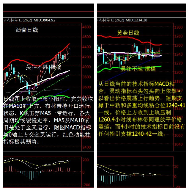 吳往不勝 4.28 現貨黃金 現貨瀝青行情解析 【4.28 操作建議】 寧貴瀝青操作建議 4210-4200一線做多,止損40個點,目標看4260-4280 4340-4350一線做空,止損40個點,目標看4280-4250 現貨黃金操作建議 1236-1238一線做多 止損4美元,目標看1248-1252 1255-1257一線做空 止損4美元.目標看1253-1248 【技術面分析指導】 現貨瀝青(寧貴瀝青)分析 美國NYMEX WTI原油6月期貨周三(4月27日)收漲1.29美元,漲幅2.93%,報45.33美元/桶。亞盤時段,美油窄幅震蕩于44.53美元/桶附近。歐市初段,小幅走高至45美元/桶附近。此后因美國EIA原油庫存增幅高于預期,同時總庫存量再度刷新紀錄最高水平,油價短線跳水約1.2美元至43.77美元/桶日低。 昨日瀝青最大回撤也是到達了昨日晚間低點的4214一線,原本的低多思路在4280附近,也就在這一線,昨日吳往不勝及時在盤中給出的4328空單建議完美獲利離場。也就在這個時候,k線運行至MA4 上方是受阻,一路上漲。多單建議獲利離場。從昨日的瀝青日線收線來看。昨日日線圖上收取一根小陽柱,完美收取在MA10的上方,布林帶持開口運行狀態,K線擊穿MA5一帶運行,各大周期均線緩慢走平,MA5及MA10依舊是處于金叉運行,附圖MACD指標與0軸上方交金叉運行,紅色動能柱指標極其弱勢;從4小時圖看,布林帶開口擴張10日均線上穿20日均線,附圖MACD金叉上行,今日必然所回調,紅色動能柱放量,KDJ超買區發散,從小時線看,瀝青昨日最高在4390一線,也是剛好突破了布林線上軌,中軌運行在4300一線,不過日內回撤到中軌附近也是概率較大,今日上方繼續關注4400一線的得失即可。日內重點關注4300-4280一線的關鍵支撐今日的主要思路吳往不勝認為還是以地為做多為主。 現貨黃金分析 美聯儲利率決定未能使金價脫離盤整區域,迎來較大突破。美聯儲對6月加息仍持公開態度,市場聚焦點將會集中在下一次加息的概率之上。日內公布的美國成屋銷售數據對黃金構成一定壓力。另外,由于金價的上漲等因素,亞洲實物黃金的需求有較大的下滑,據路透報告,在今年截止3月31日的頭三個月,全球黃金需求同比下跌了24%至781噸,是7年來最低。 黃金經過昨日晚間價格震蕩上行至日內高點1252.6后,由于利率決議的影響價格快速下跌早間多單點位1239一線后快速反彈。之后價格維持在1240-1246區間震蕩。不過日線最終收線在布林帶之上。從日線當前的技術指標MACD粘合,靈動指標石頭勾頭向上依然可以看出價格震蕩上行趨勢。短期支撐于中軌和多重均線粘合位1240-41一線。價格上方收到上軌壓制1260.4小時線布林帶同理放平價格震蕩。而4小時的技術指標目前沒有任何指引支撐1240-42一線,從當前小時線看布林帶縮口,k線平穩運行在布林帶中軌1245一線。 【消息面導讀】 周三(4月27日)美聯儲4月會議決議結果自然成了市場密切關注的對象。在本次決議上,美聯儲依然沒有給出較為明確的政策方向指引,雖然決議撤銷了海外放緩對美國經濟的影響,因此被認為偏鷹派,但這樣鷹派的決議仍然不足以改變市場對近來美國經濟放緩,升息步伐也會放緩的預期,美元在這樣的決議影響下震蕩小幅收低。原油方面,雖然EIA庫存錄得增加,但由于美元走軟和技術上的利多因素,油價繼續延續了上漲勢頭。 具體市場上,美元指數寬幅震蕩小幅收低,美聯儲4月決議略偏鷹派,但不足以改變美國經濟增長放緩美聯儲升息步伐放緩的預期;歐元兌美元寬幅震蕩,最終小幅收高,受到美聯儲決議影響加劇波動,同時受到良好歐元區經濟數據的支撐;金價連續第三個交易日上漲,美聯儲決議后縮小漲幅,仍然受美國經濟增速放緩的憂慮支撐;油價跳漲至2016年高位,受美元走軟和技術面利多因素支撐,盡管EIA原油庫存增加。 美聯儲4月決議略偏鷹派。4月27日美聯儲公布4月最新的利率決議,美聯儲維持聯邦基金基準利率0.25%-0.5%不變。美聯儲在決議中撤銷了全球事件對美國前景構成影響的內容,被市場理解為意外偏鷹信號。聲明后,美元黃金多空激烈拉鋸;油價短線受益。決議并稱就業改善、住房改善、美國增速溫和,但同時指出繼續關注通脹和全球金融形勢。 期貨利率市場對美聯儲升息的預期有小幅提升。美國聯邦基金期貨利率顯示,期貨利率市場押注美國6月加息概率為23.5%,決議前為21.6%;9月大幅飆升至49.4%,決議前也為49.4%;12月為67.7%,決議前為66.1%。 美聯儲決議的具體內容。撤銷關于全球事件對美國前景構成風險的內容。重申貨幣政策仍然保持寬松,并仍將取決于經濟數據,重申經濟形勢保證FOMC只會循序漸進地加息。維持貼現利率在1%不變,美聯儲將關注大范圍信息,以評估正確的立場。美聯儲將維持再投資措施不變,直至利率正常化處于行進之中。 【今日關注】 17:00 歐元區4月經濟景氣指數 歐元區4月工業景氣指數 20:30 美國第一季度實際GDP年化季率初值 美國第一季度實際個人消費支出季率初值 美國第一季度核心PCE物價指數年率初值 |