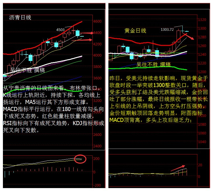 吳往不勝 5.3 現貨黃金 現貨瀝青行情解析 【5.3 操作建議】 寧貴瀝青操作建議 4240-4250一線做多,止損40個點,目標看4300-4330 4360-4370一線做空,止損40個點,目標看4310-4280 現貨黃金操作建議 1277-1279一線做多 止損4美元,目標看1290-1295 1300-1302一線做空 止損4美元. 目標看1290-1285 【技術面分析指導】 現貨瀝青(寧貴瀝青)分析 美國WTI原油從四小時走勢圖來看,5日均線已經下穿10日均線形成了死叉,K線價格在46.78高點出承壓之后就不斷震蕩下挫,當前在5、10日均線下方震蕩下行,并受其壓制;MACD指標在0軸上方死叉向下,且綠色動能柱在不斷放量,CCI指標也向下運行。綜合來看,K線價格受5、10均線的壓制,下跌動能較足。 從寧貴瀝青的日線圖來看,布林帶張口。K線運行上軌附近,持續下探。各均線上揚運行,MA5運行其下方形成支撐。MACD指標平行運行,在180一線有勾頭向下成死叉態勢。紅色能量柱放量減緩,RSI指標向下有成死叉趨勢,KDJ指標形成死叉向下發散。從四小時走勢圖來看,布林帶整體向上運行,K線價格在布林帶中軌下方運行,當前價格受上軌和前期高點強力壓制向下運行,下方MACD指標在零軸上方走緩,綠色動能柱放量,RSI指標拐頭向上運行。1小時圖來看,布林帶平行向下運行,K線運行布林帶下軌,MA5下刺10、20日均線成死叉向下運行K線上方形成壓制。MACD指標成死叉運行0軸下方,綠色能量柱放量增強。RSI、KDJ指標平行向下發散信號。綜合來看,吳往不勝認為,上方阻力較大,瀝青回落,操作上面主要看回調。 現貨黃金分析 美國COMEX 6月黃金期貨價格周一(5月2日)收盤上漲5.30美元,漲幅0.4%,報1295.80美元/盎司,六連陽的同時再度刷新2015年1月來最高收盤價。因亞洲多個市場仍處于休市狀態,亞盤黃金交投清淡,僅于1293.00至1298.50美元/盎司間窄幅橫盤震蕩。 昨日,受美元持續走軟影響,現貨黃金于歐盤時段一舉突破1300整數關口,隨后,受多頭獲利了結及美元跌幅縮減,金價回吐了部分漲幅,最終日線報收一根帶長長上引線的上吊陰線,上方空頭打壓強勢,金價短期觸頂回落走勢明顯,附圖指標MACD頂背離,多頭上攻后繼乏力;四小時方面,金價受到布林上軌壓制,繼連陽上漲后,昨日美盤時段連續收報3根陰線,K線形成三只烏鴉,預示著短期價格將會有一波強力的回調,附圖指標MACD快慢線有高位粘合的形成死叉的跡象,多頭能量柱縮量至0軸附近,隨機指標KDJ三線呈死叉向下運行,盤面總體呈現觸頂回落走勢,吳往不勝認為日內操作建議高空而為。 【消息面導讀】 周一(5月2日)由于英國和亞洲部分金融市場休市交投較為清淡,投資者把焦點從上周美聯儲決議轉移到經濟數據的表現上來,而周一美國公布的數據再度疲弱,進一步鞏固了聯儲短時間內不會升息的預期,美元觸及近一年半低位。原油方面,在連續多日上漲之后,原油市場供應過剩的炒作逐漸增多,且油價投機多頭密集也引發了多頭回補的操作,油價在周一的交投中回落調整3%。 美國NYMEX WTI原油6月期貨周一(5月2日)收跌1.14美元,跌幅2.48%,報44.78美元/桶,5月首戰出師不利。因亞洲多個國家仍處于假期休市狀態,美油低開后交投清淡,于45.60美元/桶附近窄幅震蕩。歐市時因美元下跌小幅沖高至46.15美元/桶的日高,但也僅是曇花一謝。油價轉而伶俐跌逾1.6美元至44.54美元/桶的日低,收盤前略有反彈。 與此同時,經濟數據引起了投資者們對于原油需求的擔憂。美國供應管理協會(ISM)公布的美國3月制造業指數PMI從前值51.8%下滑至50.8%,而上周日公布的中國4月制造業PMI指數也從3月時的50.2下滑至50.1,PMI數據是反應工廠活動的重要指標。 從上周末起,原油的獲利了結行情就已經開始了,上周五油價便開始收跌。周四,油價觸及了今年最高位,因投資者們寄希望于原油庫存會就這么一直降下去。 ,歐洲央行行長德拉基在發表講話時表示,全球低利率環境是全球經濟面臨挑戰的表征,也是經濟深層問題的表征,極低的利率并非無害。德拉基表示,低利率反映了投資需求不足,歐元區需要擴張的宏觀經濟穩定政策以提振需求。德拉基指出,對低利率的長期回應將是結構性再平衡,低利率或負利率并非史無前例。 德拉基表示,貨幣政策不能提高長期實際利率,只能通過結構性改革完成,結構性再平衡進展過于緩慢;中期來看,擴張性政策對儲戶有利,歐盟機構改革對于提振需求來說至關重要;從長期來看,提升實質回報率的方法必須是使全球儲蓄和投資實現平衡。 【今日關注】 17:00 歐元區3月PPI月率 22:00 美國5月IBD消費者信心指數 |