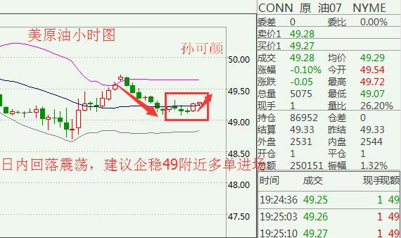 早上已經(jīng)表明了今天的總體思路,今天操作大體思路就是先看好下跌,美盤看漲,就是先跌后漲的行情,操作上是先做空油價(jià),早間的空已經(jīng)把握在手,現(xiàn)在沒單子就觀望,49美元附近的時(shí)候做多即可。