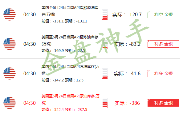金盤神手:API庫存大減,數據利多,早盤看好多頭! 國際消息:北京時間周三(6月29日)凌晨4:30,美國石油協會(API)公布的數據顯示,截至6月24日當周,美國API原油庫存大減386萬桶,預計減少237.5萬桶,降至5.272億桶,美國WTI原油期貨價格在電子盤交易中短線跳漲,突破48美元/桶關口。 具體數據,截至6月24日當周,美國API原油庫存大減386萬桶,預期減少237.5萬桶,而前值則為大減522.4萬桶。當周API汽油庫存減少41.6萬桶,預期增加12.5萬桶,前值減少147.2萬桶,當周API精煉油庫存減少83.2萬桶,預期減少22.5萬桶,前值減少169.9萬桶。 美國石油協會同時表示,截至6月24日當周,美國API庫欣地區原油庫存減少減少120.7萬桶,前值減少131.1萬桶。美國API數據公布后,由于原油、汽油和精煉油庫存均錄得下降,美國WTI原油期貨價格在電子盤交易中短線小幅跳漲,并突破48美元/桶關口。此前截至6月17日當周,美國API原油庫存大減522.4萬桶,錄得半年來最大降幅,之后,美國API原油庫存再次超預期大幅削減,無疑表明市場原油需求較為強勁。在英國脫歐憂慮暫緩情況下,美國原油庫存的削減無疑將會為國際原油價格提供短線強勁支撐。 金融市場:6月28日(周二)歐洲交易時段,受空頭回補以及英國脫歐憂慮暫緩提振,英鎊兌美元進一步反彈,且一度反彈近200點,但上行壓力仍存。市場初步顯示出調整跡象,美元指數回調,但歐洲交易時段在錄得日內低位后,穩步反彈,收窄跌幅。隨著歐洲股市出現反彈,市場風險偏好回暖,金價承壓回落。美元兌日元則穩步強勁上漲。但澳元兌美元在晚間自高位短線回落,抹掉日內漲幅。國際原油期貨價格在歐洲交易時段受市場情緒回暖以及潛在的挪威油工罷工消息提振而持續強勁反彈,但在晚間出現短線跳水,因原油多頭在美國API原油庫存公布前交投謹慎,美國WTI原油期貨價格收復47美元/桶關口。