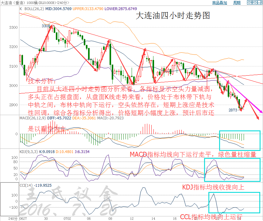 消息面: 美國WTI原油9月期貨周一(7月25日)收跌1.06美元,或2.40%,報43.13美元/桶。布倫特原油9月期貨周一收跌0.97美元,或2.12%,報44.72美元/桶。成品油庫存壓力持續(xù)上升以及美國原油產(chǎn)量出現(xiàn)抬頭跡象令油價日內(nèi)承壓下挫,美國WTI原油價格一度跌至三個月來低位,而美元依然維持在高位也增加了油價的下行壓力。美國WTI原油期貨價格盤中最低觸及43.74美元/桶,布倫特原油期貨價格盤中最低觸及45.17美元/桶。 市場回顧: 昨日大連油市場回顧,最高點2965,最低點2873,市場波動92點。 行情回顧: 昨日大連油行情走勢回顧,亞盤時間段行情震蕩下跌,歐盤時間段持續(xù)下跌,美盤時間段行情刷新日內(nèi)新低后盤整。 技術(shù)面: 目前從大連油四小時走勢圖分析來看,各指標(biāo)顯示空頭力量削弱,多頭正在占據(jù)盤面,從盤面K線走勢來看,價格處于布林帶中軌與下軌之間,布林中軌向下運行,說明空頭依然存在,短期上漲應(yīng)是技術(shù)性反彈。MACD指標(biāo)均線向下運行走平,綠色量柱縮量,KDJ指標(biāo)均線收攏向上,CCL指標(biāo)均線超賣區(qū)向上運行,綜合各指標(biāo)及盤面分析得出,價格短期小幅度上漲,預(yù)計后市還是以看空為主。 操作建議: 今日大連油整體趨勢以逢高做空為主,以低多為輔。 日內(nèi)阻力:2930/2970 日內(nèi)支撐:2840/2800 激進(jìn)者空單2900~2910區(qū)間內(nèi)可以考慮擇機(jī)入場做空,止損2940上方,目標(biāo)2870/2840。 穩(wěn)健者空單2930~2940區(qū)間內(nèi)可以考慮擇機(jī)入場做空,止損2970上方,目標(biāo)2900/2870。 激進(jìn)者多單2840~2830區(qū)間內(nèi)可以考慮擇機(jī)入場做多,止損2800下方,目標(biāo)2870/2900。 穩(wěn)健者多單2800~2810區(qū)間內(nèi)可以考慮擇機(jī)入場做多,止損2770下方,目標(biāo)2840/2880。 以上操作建議僅供參考、投資有風(fēng)險、操作需謹(jǐn)慎。 現(xiàn)貨白銀技術(shù)分析: 目前從再生銀四小時走勢圖分析,布林帶開口收攏,價格運行到布林帶中軌附近,受布林中軌強(qiáng)壓,MACD指標(biāo)均線粘合走平,KDJ指標(biāo)均線金叉向上運行,CCL指標(biāo)均線0軸附近走平,綜合各指標(biāo)及盤面分析得出,價格短期震蕩,關(guān)注上方壓力4230,上方?jīng)_破4230,后市繼續(xù)看多,反之受阻回落,繼續(xù)看空。 操作建議: 今日再生銀整體趨勢以逢高做空為主,以低多為輔。 日內(nèi)阻力:4230/4280 日內(nèi)支撐:4150/4100 激進(jìn)者空單4230~4220區(qū)間內(nèi)可以考慮擇機(jī)入場做空,止損4260上方,目標(biāo)4190/4160。 穩(wěn)健者空單4280~4270區(qū)間內(nèi)可以考慮擇機(jī)入場做空,止損4310上方,目標(biāo)4230/4200。 穩(wěn)健者多單4140~4150區(qū)間內(nèi)可以考慮擇機(jī)入場做多,止損4110下方,目標(biāo)4180/4230。 以上操作建議僅供參考、投資有風(fēng)險、操作需謹(jǐn)慎。 今日可以關(guān)注的財經(jīng)數(shù)據(jù)及事件: ① 10:00 中國7月貿(mào)易帳(按人民幣計)(億) ② 21:00 美國5月S&P/CS20座大城市房價指數(shù)年率 ③ 21:45 美國7月Markit服務(wù)業(yè)PMI初值以及綜合PMI初值 ④ 22:00 美國6月新屋銷售總數(shù)年化、美國7月諮商會消費者信心指數(shù) ⑤ 22:00 美國7月里奇蒙德聯(lián)儲制造業(yè)指數(shù) 以上操作建議僅供參考、投資有風(fēng)險、操作需謹(jǐn)慎。 【以實盤操作建議為準(zhǔn)】 (集體智慧,傾力打造。我們自成一派,贏在“多空”,更多原油投資資訊百度搜索王氏議金) 本文僅代表王氏議金個人觀點,不同平臺注意價格的換算,撰稿人:王氏議金! |