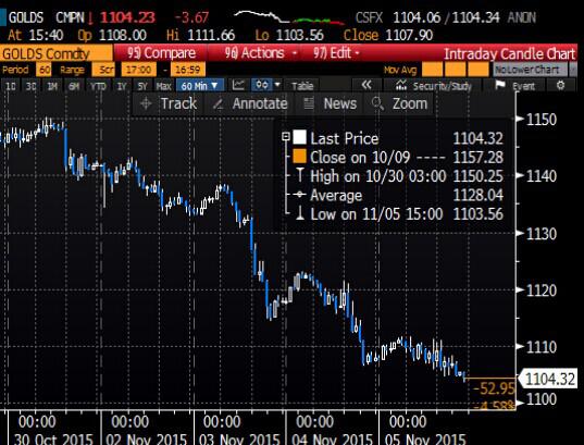 周四(11月5日)現貨金價跌至七周低位,因美元升至三個月高位,金價看似可能進一步下跌,因美聯儲官員保持了12月升息的可能性。 鈀金在貴金屬中跌幅最大,跌逾4%至六周低位。 美聯儲主席耶倫周三稱,如果未來的經濟數據提供支撐,存在12月升息的可能性。紐約聯儲主席杜德利周三稍晚對耶倫的講話表示贊同。 周四,亞特蘭大聯儲主席洛特哈特稱,美聯儲有意通過最新政策聲明改變市場的“升息”預期,并已獲得成功。 Vision Financial Markets金屬交易主任David Meger稱,“所有的壓力都來自于美聯儲12月升息的預期不斷升溫,這令美元兌一籃子貨幣走強,貴金屬普遍受壓。” 現貨金盤中跌至每盎司1,103.90美元的9月16日來最低水平,下跌0.2%,至1,105美元。美國12月期金收跌0.2%,報每盎司1,104.20美元。 金價在過去六個交易日里已經下跌約60美元,比7月觸及的1,077美元的五年半低位約高30美元。 因持有黃金沒有利息,美國公債以及其他市場回報率的上升都對金市不利。 如果周五的美國就業數據強勁,會觸發新一輪黃金賣盤,黃金目前已面臨技術面疲弱和投資者退出市場的不利局面。? 全球最大的黃金上市交易基金SPDR?Gold?Trust的黃金持有量周三跌至680.11噸,為六周最低水平。 現貨鈀金最多跌4.2%,至每盎司600美元的六周低位,勢將錄得逾四年來的最大周跌幅,鈀金在跌穿技術支撐位后跌幅擴大,同時受累于投資者對上市交易產品的投資持續減少。 現貨鉑金跌0.7%,報每盎司945.50美元。現貨銀跌至一個月低點的每盎司14.90美元。 現貨金價小時圖顯示 |