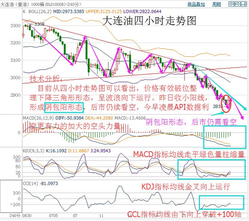 昨日周一收線再次大陰柱收線,不斷刷新低的走勢,日線級別來看,K線脫離MA5均線運行,K線運行至BOLL下軌附近,MACD綠色能量柱依舊強勢,KDJ指標超賣區運行,四小時方面,均線并列下行,BOLL向下運行,同樣有反彈需求,小周期小時線可看出,指標方面已經開始走反彈了,日內可先看反彈,日內做單需要重點關注日線級別MA5均線壓制力度,另外今晚也是一周一次的EIA數據了,在此重要數據時刻,建議是空倉等待數據,避免空頭獲利回補,建議日內以小幅反彈高空為主的思路做單。 【大連油行情分析】 目前從大連油四小時走勢圖來看,價格有效破位整理下降三角形形態,呈波浪向下運行。昨日收小陽線,形成陰包陽形態,后市仍需看空,今早凌晨API數據利空更有力的加大空頭力量。從各大技術性指標來看,MACD指標均線走平綠色量柱縮量,KDJ指標均線金叉向上運行,CCL指標均線由下向上穿破+100軸。綜合各指標及盤面分析來看,短期白間震蕩上漲,預計晚間行情下跌。 【大連油操作建議】 1、2800-2820附近做多,止損30個點,目標2840-2860附近 2、2900-2920附近做空,止損30個點,目標2880-2870附近 集體智慧,傾力打造。我們自成一派,贏在“多空”,更多原油投資資訊歡迎添加關注本人專欄。 (以上文章由春雨原創,轉載請注明出處。溫馨提示,投資有風險,入市需謹慎。以上僅代表春雨個人觀點,不作操作依據,據此操作風險自擔)