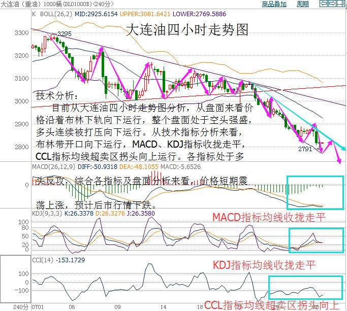 昨日原油繼續(xù)下跌,最低也跌到了41.68美元,價(jià)格持續(xù)不斷的下行為空頭帶來了很多機(jī)會(huì),連續(xù)4連陰線,并且維持空頭下跌初期階段,才剛剛打開下跌的空間,反彈后繼續(xù)做空中期不變,市場(chǎng)對(duì)于基本面供應(yīng)過剩的擔(dān)憂持續(xù)發(fā)酵,施壓油價(jià)下行。此外鉆井?dāng)?shù)量的持續(xù)回升,整體空頭占優(yōu),小周期指標(biāo)的好轉(zhuǎn)只視為反彈,并不是反轉(zhuǎn),因此交易還需反彈后介入做空為主。 大連油行情分析: 目前從大連油四小時(shí)走勢(shì)圖來看,價(jià)格有效破位整理下降三角形形態(tài),呈波浪向下運(yùn)行。昨日收小陽線,形成陰包陽形態(tài),后市仍需看空,今早凌晨API數(shù)據(jù)利空更有力的加大空頭力量。從各大技術(shù)性指標(biāo)來看,MACD指標(biāo)均線走平綠色量柱縮量,KDJ指標(biāo)均線金叉向上運(yùn)行,CCL指標(biāo)均線由下向上穿破+100軸。綜合各指標(biāo)及盤面分析來看,短期白間震蕩上漲,預(yù)計(jì)晚間行情下跌。 大連油操作建議: 1、2840-2860附近做空,止損30個(gè)點(diǎn),目標(biāo)2820-2800 2、2750-2770附近做多,止損30個(gè)點(diǎn),目標(biāo)2790-2810 集體智慧,傾力打造。我們自成一派,贏在“多空”,更多原油投資資訊歡迎添加關(guān)注本人專欄 (以上文章由春雨原創(chuàng),轉(zhuǎn)載請(qǐng)注明出處。溫馨提示,投資有風(fēng)險(xiǎn),入市需謹(jǐn)慎。以上僅代表春雨個(gè)人觀點(diǎn),不作操作依據(jù),據(jù)此操作風(fēng)險(xiǎn)自擔(dān)) |