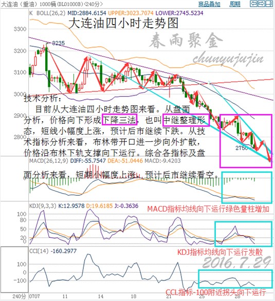 消息面: 美國WTI原油9月期貨周四(7月28日)收跌0.78美元,或1.86%,報41.14美元/桶。布倫特原油9月期貨周四收跌0.77美元,或1.77%,報42.70美元/桶。隨著原油庫存的持續(xù)上升,基本面情況愈加疲軟,雖然美元暫時走弱為油價贏得一絲喘息之機,但整體的悲觀情緒依然打壓油價再探新低。美國WTI原油期貨價格盤中最低觸及41.05美元/桶,布倫特原油期貨價格盤中最低觸及43.15美元/桶。 市場回顧: 昨日大連油市場回顧,最高點2827,最低點2750,市場波動77點。 行情回顧: 昨日大連油行情走勢回顧,亞盤時間段行情震蕩盤整,歐盤時間段行情震蕩下跌后小幅度反彈,美盤時間段行情下跌刷新日內(nèi)新低。 技術(shù)面: