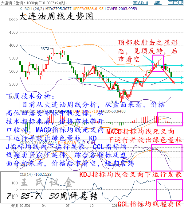 目前從大連油周線分析,從盤面來看,價格高位回落受布林中軌支撐,從技術指標來看,價格布林帶開口收攏,MACD指標均線死叉向下運行并放出綠色量柱,KDJ指標均線向下運行發散,CCL指標均線超賣區向下延伸,綜合各指標及盤面分析來看,短期震蕩上漲,預計后市行情下跌。