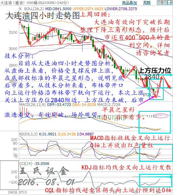 消息面: 美國WTI原油9月期貨周五(7月29日)收漲0.46美元,或1.12%,報41.60美元/桶,周線重挫6.11%,本月暴跌14.15%,為一年來最大單月跌幅。布倫特原油9月期貨周四收跌0.77美元,或1.77%,報42.70美元/桶,周線下滑4.88%,本月重挫12.53%,創去年12月來最大單月跌幅。日本央行的失望之舉和美國GDP數據的意外疲軟令美元慘遭重挫,為油價提供了強勁支撐,不過石油輸出國組織(OPEC)產量升至紀錄高位以及美國石油鉆井數的再度增加,依然令油價前景蒙上陰影。美國WTI原油期貨價格盤中最高觸及41.66美元/桶,布倫特原油期貨價格盤中最高觸及43.60美元/桶。 市場回顧: 上周五大連油市場回顧,最高點2793,最低點2721,市場波動72點。 行情回顧: 上周五大連油行情走勢回顧,亞盤時間段行情震蕩下跌,歐盤時間段行情繼續震蕩刷新日內新低后反彈,美盤時間段行情下跌后快速反彈刷新日內新高后回落。 技術面: 目前從大連油四小時走勢圖分析,從盤面上來看,價格受支撐反彈上漲,在底部收標準的造成之星形態,說明見底反彈,后市看多。從技術面分析來看,布林帶開口向上運行價格沿布林帶下軌向下運行,本次上漲關注上方壓力位2840附近,上方壓力未破,后市激進看空,反之有效突破,場外觀望。 操作建議: 今日大連油整體趨勢以逢高做空為主,以低多為輔。 日內阻力:2820/2870 日內支撐:2740/2700 激進者多單2770~2760區間內可以考慮擇機入場做多,止損2740下方,目標2800/2840。 穩健者多單2740~2730區間內可以考慮擇機入場做多,止損2700下方,目標2780/2820。 激進者空單2800~2790區間內可以考慮擇機入場做空,止損2830上方,目標2760/2730。 穩健者空單2840~2830區間內可以考慮擇機入場做空,止損2870上方,目標2800/2770。 以上操作建議僅供參考、投資有風險、操作需謹慎。 【以實盤操作建議為準】 現貨白銀技術分析 目前從再生銀四小時走勢圖分析來看,從盤面分析,價格受下方支撐反彈上漲,收早晨之星形態,后市看多。關注上方壓力位為4410上方,有效突破,后市繼續看多,反之受阻回落,后市看空。從技術指標分析來看,布林帶開口向上擴散。價格沿布林帶上軌向上運行。綜合各指標及盤面分析來看,短期震蕩上漲,預計后市行情下跌。 操作建議: 今日再生銀整體趨勢以逢高做空為主,以低多為輔。 日內阻力:4400/4440 日內支撐:4330/4300 激進者多單4330~4340區間內可以考慮擇機入場做多,止損4300下方,目標4360/4400。 穩健者多單4300~4310區間內可以考慮擇機入場做多,止損4270下方,目標4330/4360。 穩健者空單4440~4430區間內可以考慮擇機入場做空,止損4470上方,目標4400/4360。 激進者空單4400~4410區間內可以考慮擇機入場做空,止損4440上方,目標4360/4330。 以上操作建議僅供參考、投資有風險、操作需謹慎。 【以實盤操作建議為準】 今日重點關注財經數據及事件: ①09:00中國7月官方制造業PMI ②09:15紐約聯儲主席杜德利(William Dudley)在國際研討會上發表講話。 ③15:50法國7月制造業PMI終值 ④15:55德國7月制造業PMI終值 ⑤16:00歐元區7月制造業PMI終值 ⑥16:30英國7月制造業PMI ⑦21:45美國7月Markit制造業PMI終值 ⑧22:00美國7月ISM制造業PMI ⑨22:00美國6月營建支出月率 以上操作建議僅供參考、投資有風險、操作需謹慎。 不是所有的交易都美好,不是所有的行情都值得記憶,投資的悲劇源于逆勢,翻倍的完美由于順勢。市場不售來回票,一旦動身,絕不能復返,交易者有兩出悲劇:一是萬念俱灰,另一是躊躇滿志!你是零度的冰,我就是零度的水,也許我們是最好的冰水混合物!
