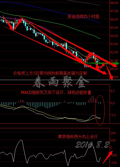 原油從四小時走勢圖來看,均線系統整體呈空頭排列,5日、10日、22日等均線一致向下運行,5日均線向下貫穿10日均線形成死叉且繼續下行,K線價格沿5日均線向下運行并受其壓制,前期低點不斷下移,目前價格在40美元上方整理。MACD指標在零軸下方形成死叉且繼續向下延伸,綠色動能柱不斷放量,CCI順勢指標拐頭向上運行。綜合來看,K線價格受上方5日均線和前期高點強力壓制,下跌動能較足,預計今日早盤油價將震蕩下行。 8.2今日美原油操作策略: 今日早盤操作上建議逢高做空,40.60美元左右做空,39美元附近做多。(以上建議僅供參考,風險自擔) 支撐、阻力點位分析: 美元指數 第一支撐:95.60;第二支撐:95.40; 第一阻力:95.80;第二阻力:96.00; 現貨黃金(美元/盎司) 第一支撐:1346;第二支撐:1340; 第一阻力:1355;第二阻力:1360; 現貨白銀(美元/盎司) 第一支撐:20.30;第二支撐:20.20; 第一阻力:20.50;第二阻力:20.60; (以上文章由春雨原創,轉載請注明出處。溫馨提示,投資有風險,入市需謹慎。以上僅代表春雨個人觀點,不作操作依據,據此操作風險自擔) 筆者(春雨聚金)簡介: 混過名校,廝殺于股市和期貨市場數年,F專注于現貨貴金屬分析,如今專家甚多,高談闊論,自覺不敢茍同,以正視聽,經濟本該理性,奈何陰謀論四起,罵娘聲不絕,甚覺無聊說點實話以道“經濟之真相”。春雨狂放之言,以貽志同道合者。 我不喜歡客戶一來就讓我給你單子,第一,我們并不熟悉,我的單子無論對與錯都是我的心血,沒有義務去交給一個不懂尊重的人,第二,一兩個單子無論對與錯都無法體驗出我的能力,第三,如果我們有緣相識,有份成為朋友,成為朋友之后,咱們可以無話不談,咱們能夠做到相互尊重,相互理解,相互信任。我不愿對不起別人,同樣,我也不愿對不起自己,你若覺得我能與你有所幫助,可以與我交流,無論結果如何,對大家而言都沒有損失,不是嗎? |