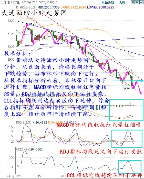 消息面: 美國WTI原油9月期貨周一(8月1日)收跌1.54美元,或3.70%,報40.06美元/桶,盤中一度自4月20日以來首次跌破40美元關口。布倫特原油9月期貨周一收跌1.39美元,或3.19%,報42.14美元/桶。石油輸出國組織(OPEC)7月產(chǎn)量料將創(chuàng)近期歷史新高,令市場供應過剩擔憂繼續(xù)升溫,同時美元回升對油價構成壓力。美國WTI原油期貨價格盤中最低觸及39.84美元/桶,布倫特原油期貨價格盤中最低觸及41.88美元/桶。 市場回顧: 昨日大連油市場回顧,最高點2810,最低點2674,市場波動136點。 行情回顧: 昨日大連油行情走勢回顧,亞盤時間段行情震蕩上漲刷新日內(nèi)新高后下跌,歐盤時間段行情繼續(xù)回落,美盤時間段行情下跌刷新日內(nèi)新低,后半夜震蕩盤面。 技術面: