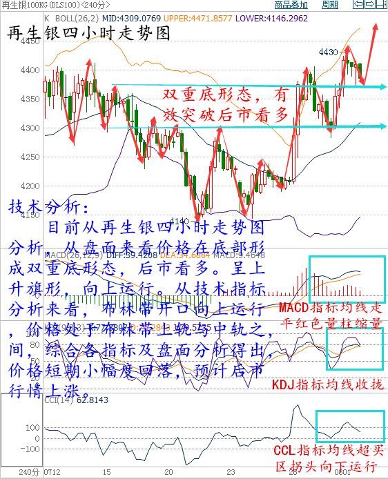 目前從再生銀四小時走勢圖分析,從盤面來看價格在底部形成雙重底形態(tài),后市看多。呈上升旗形,向上運行。從技術指標分析來看,布林帶開口向上運行,價格處于布林帶上軌與中軌之間,MACD指標均線走平紅色量柱縮量,KDJ指標均線收攏向下,CCL指標均線超買區(qū)拐頭向下運行。綜合各指標及盤面分析得出,價格短期小幅度回落,預計后市行情上漲。 操作建議: 今日再生銀整體趨勢以逢低做多為主,以高空為輔。 日內(nèi)阻力:4400/4440 日內(nèi)支撐:4330/4300 激進者多單4330~4340區(qū)間內(nèi)可以考慮擇機入場做多,止損4300下方,目標4360/4390。 穩(wěn)健者多單4300~4290區(qū)間內(nèi)可以考慮擇機入場做多,止損4260下方,目標4330/4360。 激進者空單4360~4370區(qū)間內(nèi)可以考慮擇機入場做空,止損4330上方,目標4300/4300。 穩(wěn)健者空單4400~4410區(qū)間內(nèi)可以考慮擇機入場做空,止損4440上方,目標4370/4340。 今日重點關注的財經(jīng)數(shù)據(jù)及事件: 、12:30澳大利亞至8月2日澳洲聯(lián)儲利率決定 、12:30澳洲聯(lián)儲公布利率決定及政策聲明。 、15:15瑞士6月實際零售銷售年率 、17:00歐元區(qū)6月PPI月率 、20:30美國6月核心PCE物價指數(shù)年率 集體智慧,傾力打造。我們自成一派,贏在“多空”,更多原油投資資訊歡迎添加關注本人專欄。 (以上文章由春雨原創(chuàng),轉(zhuǎn)載請注明出處。溫馨提示,投資有風險,入市需謹慎。以上僅代表春雨個人觀點,不作操作依據(jù),據(jù)此操作風險自擔) |
