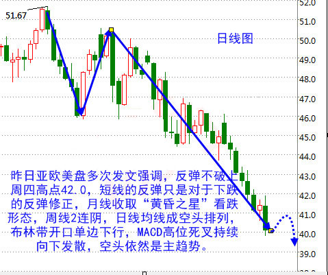 【行情回顧】 周一(8月1日)八月的第一個交易日外匯市場交投清淡,在上周疲弱美國GDP施壓美元大跌之后,周一市場窄幅整理,投資者在等待本周非農就業數據給美元的最終指引。原油方面,油價周一的跌勢可謂摧枯拉朽,供應過剩和需求疲弱進一步發酵。技術分析師指出,油價已重新跌至熊市區域,短期前景依然堪憂,美油觸及40美元關口,最終重挫4%。 美國WTI原油9月期貨周一(8月1日)收跌1.54美元,或3.70%,報40.06美元/桶,盤中一度自4月20日以來首次跌破40美元關口。布倫特原油9月期貨周一收跌1.39美元,或3.19%,報42.14美元/桶。 投資者正越來越轉向看空原油,昨日午夜至今日凌晨,WTI原油9月原油期貨跌破40美元關口,為4月7日以來首次;布油跌破42美元/桶關口。由于汽油嚴重過剩,美布兩油已經連跌了近一個月,因市場擔心全球供給過剩將進一步加劇。同時,目前油價自今年6月觸及的高位已經下跌超過20%,意味著邁入技術性熊市。 【現貨原油技術分析】 昨日多次發文強調,原油反彈不破上周四高點42.2,短線的反彈只是對于下跌的反彈修正,月線收取“黃昏之星”看跌形態,周線2連陰,日線均線成空頭排列,布林帶開口單邊下行,MACD高位死叉持續向下發散,空頭依然是主趨勢。