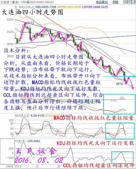 全球供應量遠遠超出需求,再平衡的速度如此緩慢,即使是尼日利亞正在發生內亂之類的地緣政治因素都不足以抵消油價的跌勢。雪上加霜的是,美國和亞洲的許多煉油廠正處在季節性檢修期。開工率下降將加劇供應過剩狀況,因為原油將無處可去。他補充說,這種季節性跌勢仍可能使油價跌至35美元/桶,情況或在今年年底扭轉。 本人認為,油價反彈過程將是緩慢的,因為原油過剩現象需要較長一段時間才會消失。王氏議金預計,2016年四季度美國原油均價料將為每桶49.50美元,2017年將突破關鍵位50美元。“市場再平衡的速度將極其緩慢,我們認為2017年第二季度前不大可能看到可持續的供不應求。如果想要壓低全球的庫存水平,供不應求是必要條件,但可能要到2018年末才可能出現這種情況。” 克里夫表示,缺乏投資將嚴重影響全球供應,只要市場意識到過度供應不復存在,而且供應短缺即將到來,油價就會大幅上升。他預測明年的布倫特油價能達到70美元。 然而,隨著油價上漲,首先受益的將是美國頁巖油生產商。弗勞爾斯預測頁巖油產量將在明年初觸底,但將在兩年內重返2015年創下的紀錄高位——約450萬桶/日;由于頁巖油成本可能節省高達四成,弗勞爾斯認為到下一個十年中期,頁巖油產量將可能增加近一倍至850萬桶/日。 技術面: 目前從大連油四小時走勢圖分析,從盤面來看,價格長期處于下跌趨勢,沿布林帶下軌向下運行。從技術指標分析來看,布林帶開口向下運行擴散,MACD指標均線收攏紅色量柱縮量,KDJ指標均線死叉向下運行發散,CCL指標均線到達超賣區向下延伸,綜合各指標及盤面分析得出,價格短期小幅度上漲,預計后市行情繼續下跌。 操作建議: 今日大連油整體趨勢以逢高做空為主,以低多為輔。 日內阻力:2730/2760 日內支撐:2650/2610 激進者空單2700~2710區間內可以考慮擇機入場做空,止損2740上方,目標2670/2640。 穩健者空單2730~2740區間內可以考慮擇機入場做空,止損2770上方,目標2700/2670。 激進者多單2670~2680區間內可以考慮擇機入場做多,止損2650下方,目標2700/2730。 穩健者多單2650~2660區間內可以考慮擇機入場做多,止損2620下方,目標2680/2700。 以上操作建議僅供參考、投資有風險、操作需謹慎。 【以實盤操作建議為準】 不是所有的交易都美好,不是所有的行情都值得記憶,投資的悲劇源于逆勢,翻倍的完美由于順勢。市場不售來回票,一旦動身,絕不能復返,交易者有兩出悲劇:一是萬念俱灰,另一是躊躇滿志!你是零度的冰,我就是零度的水,也許我們是最好的冰水混合物!