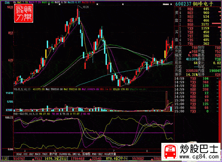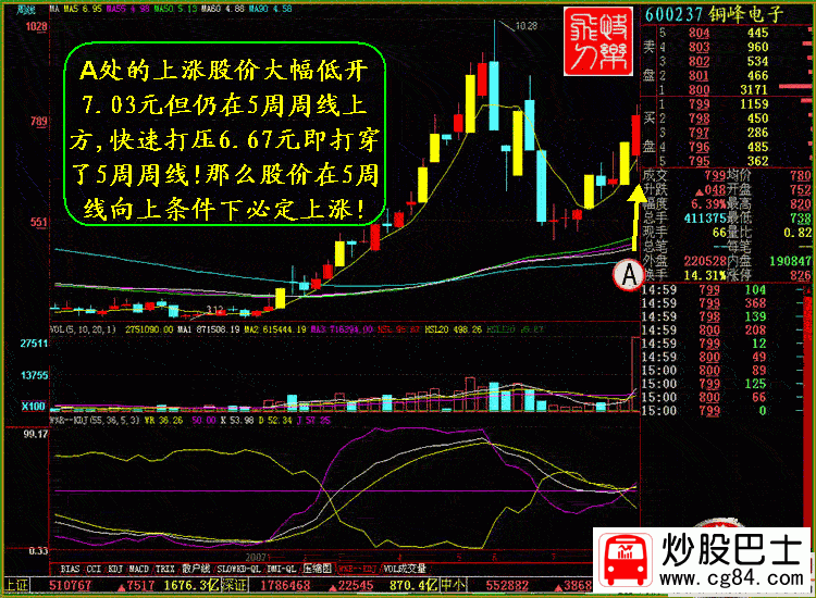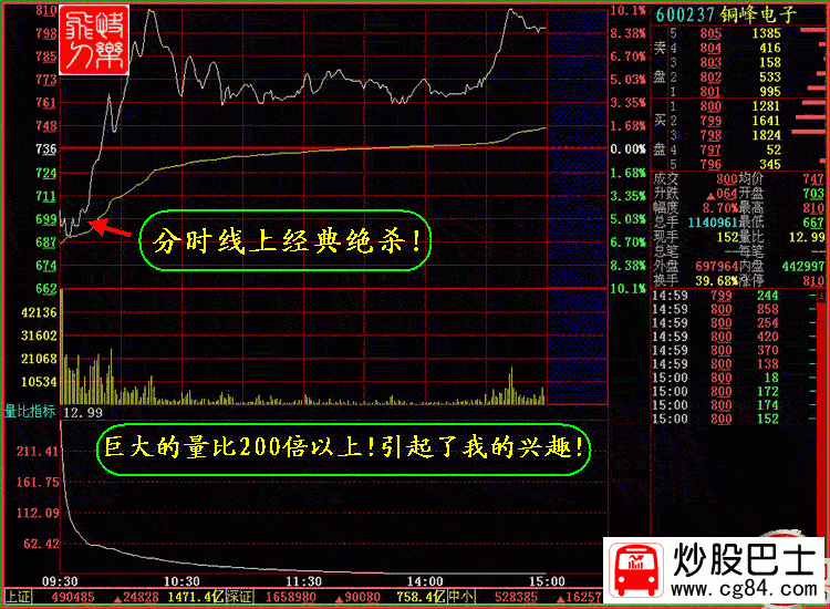 一.低開巨量比絕殺 低開+巨大量比+牛市狀態=短中長期牛股 某股票當突然大幅低開,市場中該股的投資者莫名其妙.首先想到的可能是利空.但是該股盤中不斷地巨量成交,股份不斷上行,讓不明真相產生了恐慌的投資者有出局的機會,最終該股以長陽報收, 如此,莊家既達到了快速收集籌碼的目的,同時又很好地震了倉. 如某股突然大幅低開,量比幾十倍或更高,則當日必定會成為巨量!從周線上看5周周線向上運行,而股價已經跌穿5周周線,必然的巨大的成交狀態下,股價快速向上大幅上漲! 股票實例:600237 銅峰電子 時間:2007年8月20日 量比狀態 :當天開盤量比200倍以上. K線狀態:當天的股價以7.03元低開,在巨大的成交推動作用下,股價沒有繼承前一日的漲停的強勢,而是大幅低開讓人恐慌,在低開后迅速打壓至最低6.67元 ,股價分時線形成了蜻蜓點水的形態后,向上突破之后形成了強有力的三波上漲,一度攻上漲停,在盤中產生大幅 震蕩,尾盤上漲,8.7%全天換手39.68%.本人是在7.0元介入的! 此股也太經典了,我記得有人說強勢股如周一大漲,周二,周三,調整,周四,周五上漲,周K線上仍然收陽!而此股周一是低開巨量長陽,經過三天的調整最低價正好處于周一震幅的一半處!周五沒有創出新低下午隨大盤再度放量上攻!大漲6%以上