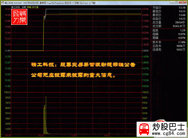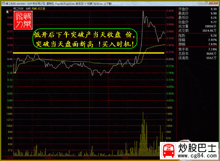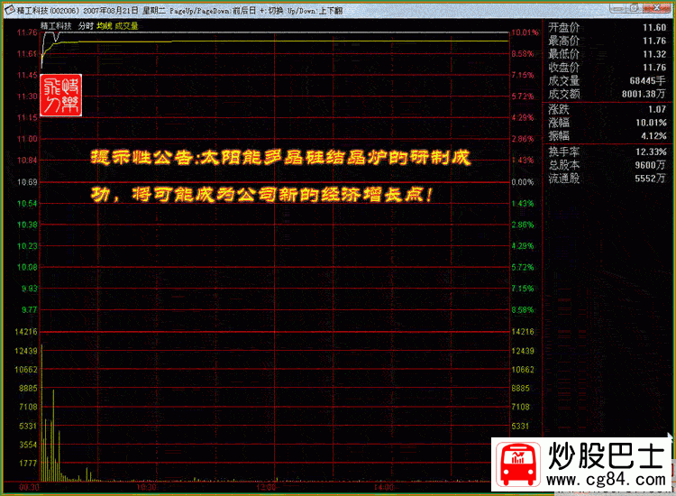 二.巨量之破頂沖關 K線形態:在某種利好的刺激下,股價連續數日上漲,在前頭部放出巨量,最終以漲停板報收,說明主力統吃上方籌碼 ,上攻心態急切!當前幾日,本人沒有對該股引起足夠關注,當發現時,已經快漲停了,當時估計如能封停,第二日可能會呈現高開高走縮量封停的走勢,后來的走勢正如我所估計的,但可惜的是,在封停后,本人一看沒有成交就很快撤單了,盤中沒有再看過!盤后分析時發現完全有時機介入! 股票實例: 002006精工科技 時間 :2007年8月22日 在加息的下刺激下,該股 不但沒有低開,反而當天以11.98元高開,開盤70倍以上的量比 ,很快封停隨后打開 ,盤中曾一度跌到漲停的5%.正是時機!在盤中不斷地入巨量成交,10:30準時封停,之后,漲停板反復打開,給人恐慌,不斷地有人出逃,上午收盤前封停,收盤后從成交量上看,換手極度萎縮!說明該跑的都跑了!盤中曾一度跌到漲停的5%.正是時機!在盤中不斷地入巨量成交,10:30準時封停,之后,漲停板反復打開,給人恐慌,不斷地有人出逃,上午收盤前封停,收盤后從成交量上看,換手極度萎縮!說明該跑的都跑了!當天的換手率31.88%! K線分析:2007年8月20日,該股在消息真空時,高開高走,迅速封停,當日的換手7.57%,最佳換手漲停! 8月21日出消息:002006 精工科技生命歷程: 2007年8月21日 精工科技:太陽能多晶硅結晶爐單臺研制成功到形成批量生產還需要較長時間 精工科技(002006)2007年8月20日,《證券時報》刊登了《精工科技造出太陽能多晶硅結晶爐,成為國內唯一能生產太陽能核心設備的廠家》,現公司對上述事項說明如下: 1、公司控股子公司紹興縣精工機電研究所有限公司目前已經研制成功了太陽能多晶硅結晶爐1臺,并于2007年6月開始推向市場,上述事項公司已在《2007年半年度報告》中作了披露。 目前,紹興縣精工機電研究所有限公司正在對研制的太陽能多晶硅結晶爐核心技術申請國家專利。 2、太陽能多晶硅結晶爐的研制成功,將可能成為公司新的經濟增長點。但是,該產品的單臺研制成功到形成批量生產,尚需很多工作要做,還需要較長的時間,因此,形成具體的產能和產量還存在較大的不確定性,請投資者注意投資風險。 同樣,高開高走再度封停,這種目的就是不讓跟風盤介入!