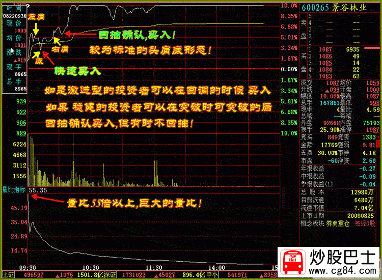 四.開盤時的巨量買入法 量比要求:量比要大,最好幾十倍,(有時得根據情況而定)K線形態:有前一日的上漲或近幾日有所上漲最好,當日首次放巨量,或承接前一日放量,高開高走,可追漲買入! 股票案例:600265 景谷林業 時間:2007年8月22日 大盤環境:牛市中的加息日 股票 說明:前一天,股票以漲停收盤,在加息的環境下,高開1.43%,開盤時的量比55倍,高開高走,隨后回落,在形成了較標準的頭肩底后,再度封停,盤中有多次打開,說明上方拋壓較重,第二日可擇機賣出,當天終以漲停收盤,換手率25.99%,23日開盤11.20元,高開3%以上,高開幅度較大,快速上沖至11.40元快速被打壓下來,在跌破分時均價線時可以快速較低掛單賣出! 600265量比巨大買入法