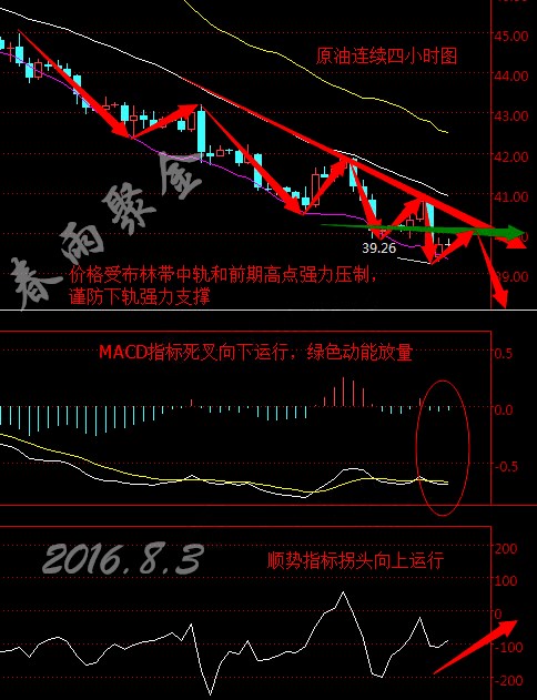 原油連續從四小時走勢圖來看,布林帶整體依舊向下運行,上、中、下三軌一致下行,K線價格自下軌受支撐上行,未觸及中軌便承壓下行再次跌穿下軌(40美元大關),前期低點不斷下移,目前價格稍有回升徘徊在40美元下方。MACD指標在零軸下方形成死叉且繼續下行,綠色動能柱不斷放量,CCI順勢指標拐頭向上運行。綜合來看,K線價格受布林帶中軌和前期高點強力壓制,下跌動能較足,預計今日早盤油價將小幅回升再震蕩下行。 8.3今日美原油操作建議: 今日早盤操作上建議逢高做空,40.20美元左右做空,38.50美元附近做多。(以上建議僅供參考,風險自擔) 支撐、阻力點位分析: 美元指數 第一支撐:95.0;第二支撐:94.8; 第一阻力:95.4;第二阻力:95.6; 現貨黃金(美元/盎司) 第一支撐:1360;第二支撐:1355; 第一阻力:1367;第二阻力:1375; 現貨白銀(美元/盎司) 第一支撐:20.50;第二支撐:20.40; 第一阻力:20.70;第二阻力:20.80; 集體智慧,傾力打造。我們自成一派,贏在“多空”,更多原油投資資訊歡迎添加關注本人專欄。 (以上文章由春雨原創,轉載請注明出處。溫馨提示,投資有風險,入市需謹慎。以上僅代表春雨個人觀點,不作操作依據,據此操作風險自擔) |