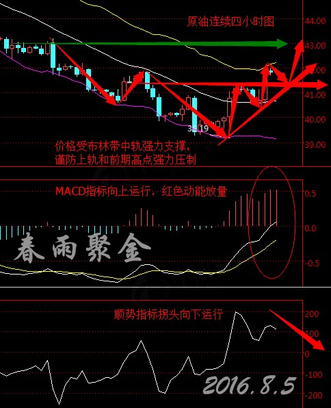 今日分析策略: 美國WTI原油9月期貨周四(8月4日)收漲1.10美元,或2.69%,報41.93美元/桶。布倫特原油10月期貨周四收漲1.19美元,或2.76%,報44.29美元/桶。 庫欣庫存的續降增加了美國上周汽油庫存大減的利多影響,即使美元回升也未能阻止油價今日延續漲勢,同時空頭回補操作也為油價提供了強勁支撐,美油和布油盤中分別突破42和44美元關口。 據看到市場情報公司Genscape報告的交易員稱,截至8月2日當周,美國原油交割地俄克拉荷馬州庫欣庫存減少8.9071萬桶。此前美國政府數據周三顯示,截至7月29日當周,庫欣庫存減少110萬桶。 周四(8月4日),英國央行如期宣布降息至紀錄低位,并實施600億英鎊購債計劃,放寬政策力度令市場意外。目前,市場聚焦晚間美國非農數據,市場料將掀起一場腥風血雨。 技術面分析: