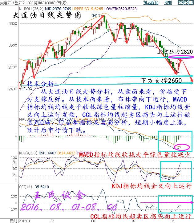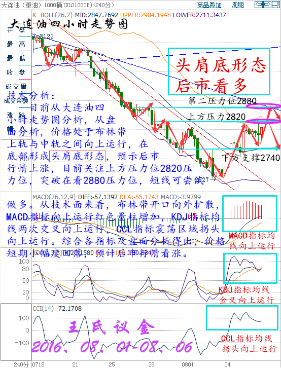 大連油本周行情回顧:周一(8月1日) 亞市盤初,美油大幅上漲,交投于41.60美元/桶附近,漲幅為1.07%;布油震蕩下跌,交投于43.50美元/桶附近,跌幅為0.07%。雖然,美國GDP數(shù)據(jù)意外不佳令美元回落,使美元計價的油價短線小幅反彈,但經(jīng)濟增長放緩和原油和成品油庫存高企拖累令油價承壓。但上周五公布的數(shù)據(jù)顯示,美國原油鉆井平臺數(shù)增至374口,連增5周,或限制油價漲幅。上周五(7月29日)美國WTI 9月原油期貨價格收盤上漲0.24美元,漲幅0.58%,報41.38美元/桶,油價上周大跌后本月重挫近15%,因供應(yīng)過剩問題持續(xù),美國原油期貨月線跌幅為一年最大。 周二(8月2日) 美國WTI 9月原油期貨價格周一(8月1日)收盤下跌1.52美元,跌幅3.65%,報40.08美元/桶,油價周一收盤急挫近4%,美國原油4月以來首次盤中跌破40美元/桶,盡管夏季是燃料需求高峰期,但對原油庫存過剩的憂慮仍持續(xù)升溫。與此同時,ICE布倫特10月原油期貨價格收盤下跌1.31美元,跌幅3.01%,報42.22美元/桶。在剛剛過去的7月,美國原油價格急挫15%,為一年來最大單月跌幅,在8月第一個交易日激發(fā)了清倉賣盤。油價周一大跌,此前有消息稱,石油公司rathon Petroleum周末意外關(guān)停了伊利諾伊州羅賓遜日處理能力21.2萬桶的煉廠唯一的原油加工和附屬設(shè)施,關(guān)停原因和期限尚不得而知。 周三(8月3日) 亞市盤中,NYMEX 9月原油期貨價格跳空高開高走后探底回升,目前小幅回落,但整體維持上行勢態(tài),交投于39美元上方。在供應(yīng)過剩憂慮的沖擊下,油價下破40美元關(guān)口,此前曾一度錄得六連陰。周三早盤油價的溫和上漲與周一(8月1日)和周二(8月2日)亞市表現(xiàn)類似,目前關(guān)注歐市及美市是否如前兩個交易日般承壓,由于汽油供應(yīng)過剩導(dǎo)致油市走軟,“怪圈”再現(xiàn)的幾率較大。稍早公布的數(shù)據(jù)顯示,美國7月29日當(dāng)周API原油庫存減少134萬桶,降幅不及預(yù)期但好于前值,可能為油價提供輕微支撐。不過只有在美國經(jīng)濟數(shù)據(jù)意外向好的情況下,油價在歐市及美市承壓的現(xiàn)象才有可能消失。 周四(8月4日) 原油盤初,受EIA庫存報告,汽油庫存和庫欣庫存下降的提振,油價延續(xù)隔夜升勢。美油交投于41.23美元/桶附近,漲幅為0.98%;布油交投于43.46美元/桶附近,漲幅為0.84%。但原油供應(yīng)過剩仍是“魔咒”,須謹(jǐn)防油價進一步下跌。美國能源信息署(EIA)公布數(shù)據(jù)顯示,汽油庫存降幅遠超預(yù)期,抵消了原油庫存意外增加帶來的利空影響。同時,經(jīng)歷多日下跌后,美油已現(xiàn)超賣跡象,在抄底資金的推動下,油價出現(xiàn)大幅反彈走勢。 周五(8月5日) 亞洲時段國際油價震蕩走弱,美原油9月期貨一度跌逾1%至41.50美元/桶,布倫特原油10月期貨最低觸及43.82美元/桶,因空頭回補引發(fā)的反彈動能有所減弱,供給過剩仍令油價承壓,美油下方關(guān)注5日均線40.86美元附近的支撐,上方關(guān)注20日均線42.22美元附近的阻力。原油和成品油產(chǎn)量過多令油市繼續(xù)承壓,石油生產(chǎn)過剩已導(dǎo)致陸上儲油罐不堪負(fù)荷,一些油輪也被租下來用于儲存未出售的石油。 大連油技術(shù)分析:技術(shù)分析: 目前從大連油四小時走勢圖分析,從盤面分析,價格處于布林帶上軌與中軌之間向上運行,在底部形成頭肩底形態(tài),預(yù)示后市行情上漲,目前關(guān)注上方壓力位2820壓力位,突破在看2880壓力位,短線可嘗試做多。從技術(shù)面來看,布林帶開口向外擴散,MACD指標(biāo)向上運行紅色量柱增加,KDJ指標(biāo)均線兩次交叉向上運行,CCL指標(biāo)震蕩區(qū)域拐頭向上運行。綜合各指標(biāo)及盤面分析得出,價格短期小幅度回落,預(yù)計后市行情看漲。