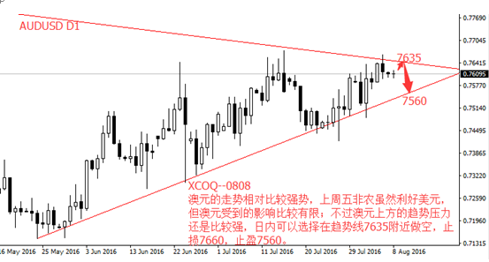非美走勢中,澳元的走勢相對比較強勢,非農數據雖然利好美元,打壓非美,但是,澳元受到的影響還是比較有限;不過,從澳元日線走勢看,趨勢線的壓力還是比較強勢,澳元想要突破還是有較大的難度,因此,近期操作可以選擇高空澳元,日內可以選擇在7635附近做空,止損7660,止盈7560。