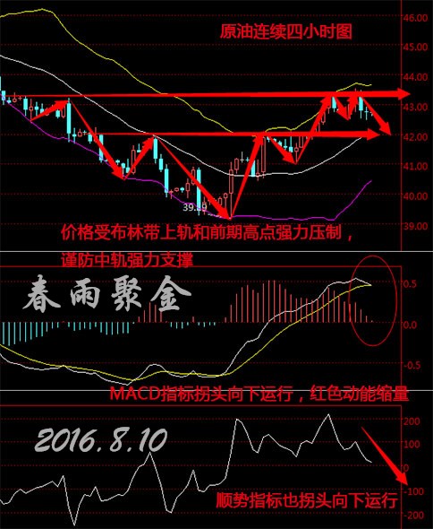 原油連續從四小時走勢圖來看,布林帶整體雖向上運行,上、中、下三軌一致向上,但K線價格自上軌處承壓下行,觸碰中軌,目前價格在43美元下方整理。MACD指標在零軸上方拐頭向下運行,有形成死叉的趨勢,,紅色動能柱不斷縮量,CCI順勢指標也拐頭向下運行。綜合來看,K線價格受布林帶上軌和前期高點強力壓制,下跌動能較足,預計今日早盤油價將震蕩下行。 8.10美原油操作策略: 今日早盤操作上建議逢高做空,43.30美元左右做空,42美元附近做多。(以上建議僅供參考,風險自擔) 支撐、阻力點位分析: 美元指數 第一支撐:95.70;第二支撐:95.60; 第一阻力:96.10;第二阻力:96.20; 現貨黃金(美元/盎司) 第一支撐:1340;第二支撐:1338; 第一阻力:1350;第二阻力:1353; 現貨白銀(美元/盎司) 第一支撐:19.90;第二支撐:19.80; 第一阻力:20.10;第二阻力:20.20; 集體智慧,傾力打造。我們自成一派,贏在“多空”,更多原油投資資訊歡迎添加關注本人專欄! (以上文章由春雨原創,轉載請注明出處。溫馨提示,投資有風險,入市需謹慎。以上僅代表春雨個人觀點,不作操作依據,據此操作風險自擔) |
