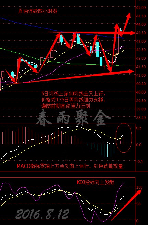 今日分析策略: 美國WTI原油9月期貨周四(8月11日)收漲1.78美元,或4.27%,報43.49美元/桶。布倫特原油10月期貨周四收漲1.99美元,或4.52%,報46.04美元/桶。 沙特能源、工業和礦產資源大臣法力赫(Khalid al-Falih)表示,石油輸出國組織(OPEC)和非OPEC產油國將在9月26-28日阿爾及利亞的非正式會議期間討論市場狀況,包括可能采取穩定油價所需的行動。 IEA在月報中預估未來數月全球原油庫存將穩健下滑,這將有助于緩解過剩窘境;此番供應過剩自2014年以來延續自今,因來自OPEC與非OPEC的供應齊揚。IEA月報喜憂參半,但利多因素大于利空因素,對油價構成一定支撐。 但美國勞工部周四(8月11日)公布的數據顯示,美國上周首次申領失業救濟人數在近40年低點附近持穩,凸顯了美國就業市場強勁。受此提振,美元指數自周三觸及的近一周低位95.442反彈。美元走強限制了油價的上行空間。 另外,周六凌晨1點,交易原油的投資者也不能忽視貝克休斯鉆井平臺數據的表現。該數據對于判斷油價中長期走勢有較為重要的參考意義,短線影響可能有限。 技術面分析: