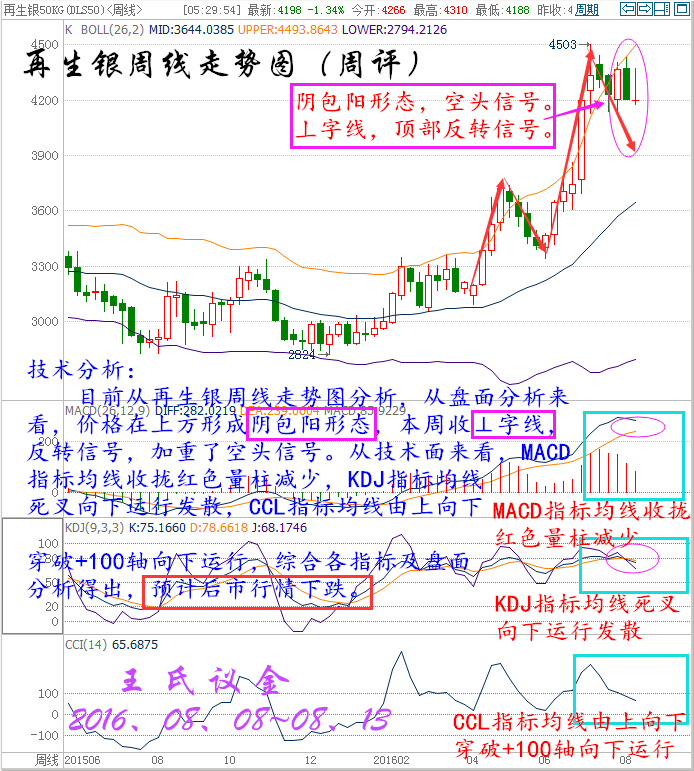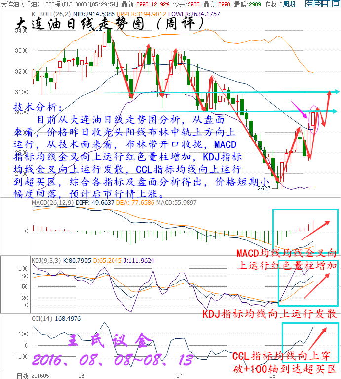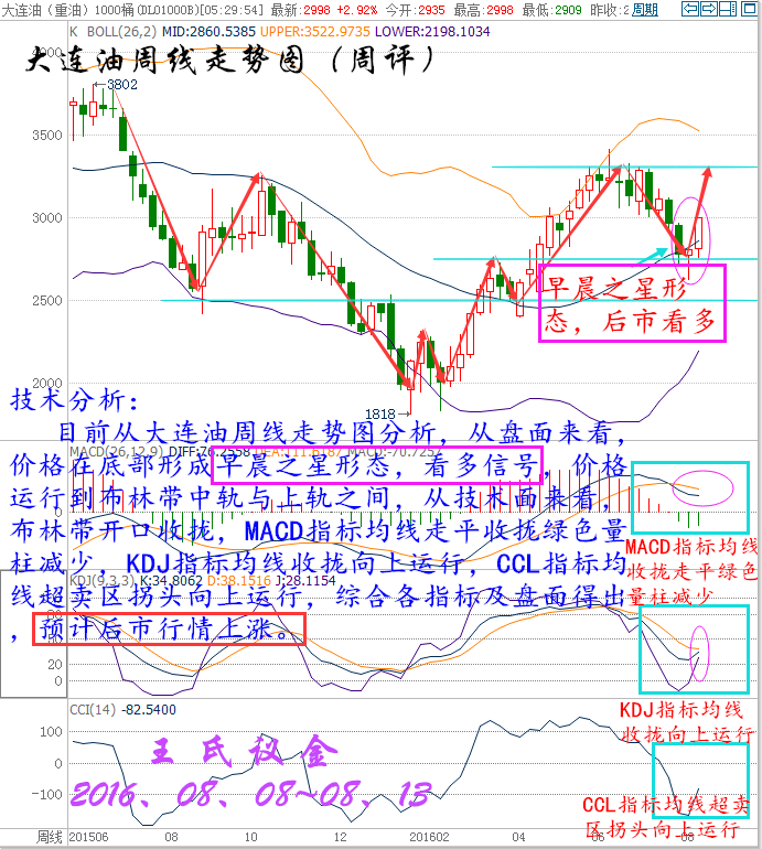 時間過的好快,一周就要說聲拜拜,八月轉眼進入下旬,一年已經揮霍過半,一生踏入而立之年。好多事還未準備,好多夢還未開始,公平于時間,也區別于時間。情商決定了成就事業的大小,執行決定了靠近夢想的距離。投資是人性的顯示器,投資也是人生的縮影,你就是主角,更是導演,所有的喜劇或悲劇都是親自勾畫的結果。 過去,經常聽到一句話:別講那么多,直接告訴哥咋干,多或空?。意思就是說別扯沒用的,不管什么貓逮著老鼠才是好貓,浮躁的社會已經變的如此不安,人人都想張口要一個心里想,卻從不為這背后的原由來聆聽,這就導致了同樣的行情經常出現,卻被不同的人反復實驗,早盤的急漲、趨勢破位的回踩、急跌反抽后的上升,這是隔三差五就碰到,但人們已經沒了聽完的耐心…… 美國WTI原油9月期貨周五(8月12日)收漲1.00美元,或2.30%,報44.49美元/桶,本周大漲6.22%。布倫特原油10月期貨周五收漲0.93美元,或2.02%,報46.97美元/桶,本周急升6.1%。凍產傳聞再度浮現的影響仍在持續發酵,日內美元走弱也為油價提供了有效支撐,不過由于美國石油活躍鉆井數大幅增加,油價漲勢能否持續成為疑問。美國WTI原油期貨價格盤中最高觸及44.60美元/桶,布倫特原油期貨價格盤中最高觸及47.05美元/桶。 本周行情回顧: 周一(8月8日)原油盤初,油價小幅上漲。美油交投于41.98美元/桶附近,漲幅約為0.43%;布油交投于44.40美元/桶附近,漲幅約為0.29%。油價跌穿40美元后獲利的投資者進一步結清空頭頭寸,扶助油價反彈。但是,美國石油活躍鉆井數增加7座至381座,錄得連續第六周增長,油市供應過剩的壓力尚存,仍令油價承壓,市場交投仍需謹慎。強勁的美國就業數據帶動美元上漲,令油價稍早承壓。尾盤的回補空頭,使油價扳回部份稍早錄得的跌幅,收盤小幅上漲。 周二(8月9日)原油盤初,油價小幅下跌。美油交投于42.80美元/桶附近,跌幅約為0.51%;布油交投于45.17美元/桶附近,跌幅約為0.48%。市場分析認為,有關石油輸出國組織(OPEC)可能重啟凍產計劃的傳聞對油價的提振作用十分有限。供應過剩壓力猶存,加之美元走強,限制油價上行空間,市場交投仍需謹慎。因有關石油輸出國組織(OPEC)可能重啟凍產計劃的臆測重燃,緩解了市場對原油供應過剩的擔憂情緒,從而提振油價。 周三(8月10日)亞歐時段油價油價震蕩走弱,美原油一度跌逾1%創兩日低點至42.27美元/桶,布倫特原油10月期貨最低觸及44.50美元/桶,EIA短期能源報告上調美國產量預期,凌晨API原油庫存意外增加,都給空頭反撲提供了機會,市場繼續關注晚上出爐的美國EIA原油庫存數據。凌晨EIA發布短期能源報告稱,將美國2016年原油產量預期從861萬桶/日上調至873萬桶/日。將美國2016年原油需求增速預期維持在16萬桶/日不變。 周四(8月11日)亞歐時段國際油價小幅走弱,美原油9月期貨目前交投于41.46美元/桶,布倫特原油10月期貨目前交投于43.77美元/桶,隔夜美國EIA庫存意外大增,且沙特原油產量創紀錄新高,令油價再次遭遇重擊,目前市場人氣較為低落,油價料將重回跌勢。因美國原油庫存增加,且沙特產量創下紀錄,強化了對于持續的供給過剩將持續到明年的擔憂。美國能源信息署(EIA)數據顯示,上周美國原油庫存增加105.5萬桶,至5.236億桶,市場預估為減少102.5萬桶。數據公布后油價大跌逾3%。 周五 (8月12日)原油盤初,油價延續漲勢,小幅震蕩拉升。美油交投于43.61美元/桶附近,漲幅約為0.28%;布油交投于46.10美元/桶附近,漲幅約為0.13%。周四發布的IEA月報緩解市場看空情緒,且沙特油長講話令凍產計劃再次浮出水面,在很大程度上提振市場的樂觀情緒。但是,分析師認為供應過剩的問題尚存,利好影響或有限,市場交投仍需謹慎。國際能源署(IEA)表示,2016下半年原油供應過剩的狀況將不復存在,這在很大程度上緩解了近期以來彌漫原油市場的過剩擔憂情緒。此外,沙特油長稱可能采取行動穩定油價,這也在一定程度上提振市場樂觀情緒。國際油價周四飆升逾4%。 大連油技術分析: 技術分析: 目前從大連油四小時走勢圖,從盤面來看,價格沿布林上軌向上運行,昨日在頂部收“吊頸線”,見頂信號,后市看小幅度回落。從技術面來看,MACD指標均線金叉向上運行并放出紅色量柱,KDJ指標均線向上運行發散,CCL指標均線超買區回落走平,綜合各指標及盤面分析得出,短期小幅度回落,預計后市行情繼續上漲。 技術分析: 目前從大連油日線走勢圖分析,從盤面來看,價格昨日收光頭陽線布林中軌上方向上運行,從技術面來看,布林帶開口收攏,MACD指標均線金叉向上運行紅色量柱增加,KDJ指標均線金叉向上運行發散,CCL指標均線向上運行到超買區,綜合各指標及盤面分析得出,價格短期小幅度回落,預計后市行情上漲。 技術分析: 目前從大連油周線走勢圖分析,從盤面來看,價格在底部形成早晨之星形態,看多信號,價格運行到布林帶中軌與上軌之間,從技術面來看,布林帶開口收攏,MACD指標均線走平收攏綠色量柱減少,KDJ指標均線收攏向上運行,CCL指標均線超賣區拐頭向上運行,綜合各指標及盤面得出,預計后市行情上漲。 下周一策略 下周一大連油整體趨勢以逢低做多為主,以高空為輔。 日內阻力:3045/3075 日內支撐:2965/2935 激進者空單3000~2990區間內可以考慮擇機入場做空,止損3030上方,目標2965/2935。 穩健者空單3045~3055區間內可以考慮擇機入場做空,止損2085上方,目標3000/2965。 激進者多單2975~2985區