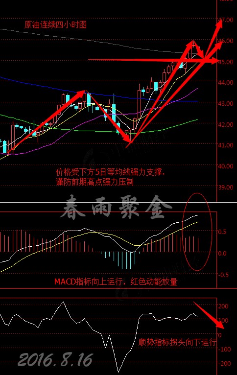 原油連續從四小時走勢圖來看,均線系統整體呈多頭排列,5日、10日、22日等均線一致向上運行,5日均線上穿10日均線形成金叉,且繼續上行貫穿22日、135日均線,K線價格沿5日均線震蕩上行,目前價格在45.50美元上方整理。MACD指標向上延伸,紅色動能柱不斷放量,CCI順勢指標拐頭向下運行。綜合來看,K線價格受下方5日等均線強力支撐,上漲動能較足,預計今日早盤油價小幅回落再震蕩上行。 8.16美原油操作策略: 原油回撤見45.20的位置正負0.05美金則繼續做多不變,止損放在44.60,目標則繼續看高點46-46.20的區域。(以上建議僅供參考,風險自擔) 支撐、阻力點位分析: 美元指數 第一支撐:95.50;第二支撐:95.40; 第一阻力:95.70;第二阻力:95.80; 現貨黃金(美元/盎司) 第一支撐:1338;第二支撐:1335; 第一阻力:1345;第二阻力:1350; 現貨白銀(美元/盎司) 第一支撐:19.80;第二支撐:19.70; 第一阻力:19.90;第二阻力:20.00; (以上文章由本人春雨撰寫,轉載請注明出處,溫馨提示:投資有風險,入市需謹慎,建議僅供參考!) |
