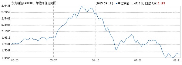 基金全稱:東方精選混合型開放式證券投資基金 基金簡稱:東方精選 基金代碼:400003(前端)、400004(后端) 基金類型:混合型 發行日期:2005年11月21日 成立日期/規模:2006年01月11日 / 3.458億份 資產規模:54.95億元(截止至:2015年06月30日) 份額規模:24.1013億份(截止至:2015年06月30日) 基金管理人:東方基金 基金托管人:民生銀行 基金經理人:邱義鵬、朱曉棟 成立來分紅:每份累計0.58元(5次) 管理費率:1.50%(每年) 托管費率:0.25%(每年) 銷售服務費率:---(每年) 最高認購費率:---(前端) 最高申購費率:1.50%(前端) 最高贖回費率:0.50%(前端) 業績比較基準:中信標普300成長指數×60%+中證綜合債指數×40% 跟蹤標的:該基金無跟蹤標的