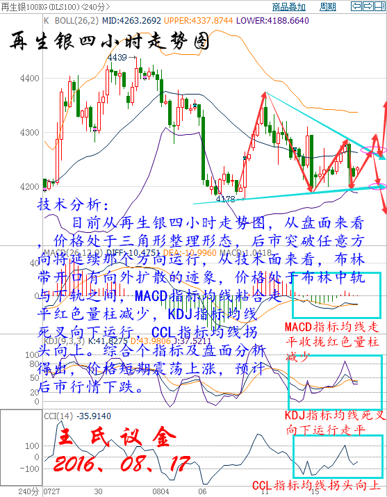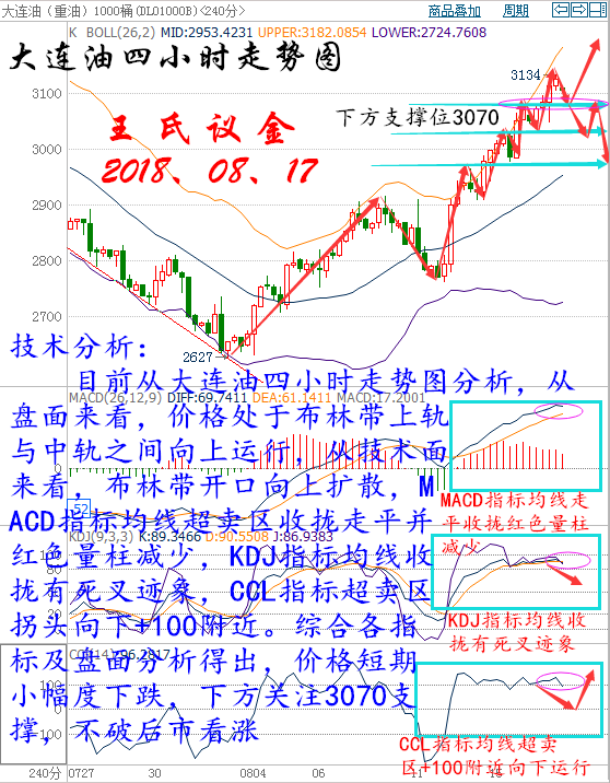 投資最遺憾的,莫過于輕易地放棄了不該放棄的,固執地堅持了不該堅持的。強勢人格是內在的傲骨,而不是外在的傲氣,成長的路沒有捷徑,只是頓悟的早晚,人生最怕的不是錯了,而是明知是個坑還總幻象奇跡,把偶發事件當成了憧憬對象,真正的高手就如我一樣清晰的知道狙擊的時擊和方向。 美國WTI原油9月期貨周二(8月16日)收漲0.84美元,或1.84%,報46.58美元/桶。布倫特原油10月期貨周二收漲0.88美元,或1.82%,報49.23美元/桶。產油國會議的影響仍在發酵,投資者押注下月或能達成穩定油市的協議,同時美元回落也為油價提供了有效支撐。美國WTI原油期貨價格盤中最高觸及46.73美元/桶,布倫特原油期貨價格盤中最高觸及49.36美元/桶。 基本面利好因素: 美國勞工部公布的數據顯示,美國7月季調后CPI月率上升0%,升幅創今年2月以來最低,因汽油價格錄得五個月來的首次下跌,表明美國潛在通脹壓力溫和,這可能會進一步削弱美聯儲的年內加息前景。雖然美聯儲“三號人物”、紐約聯儲主席杜德利的鷹派講話嚇壞市場,但美元日內依然回落,這為油價提供了有效支撐。 沙特能源部長法利赫(Khalid al-Falih)近期表示,將在下個月與OPEC和非OPEC產油國會面,討論油市問題,凍產計劃再次浮上水面。國際能源論壇將于9月26日-28日在阿爾及利亞舉行,卡塔爾油長此前曾表示OPEC成員國將在論壇會議間隙展開討論。同時俄羅斯能源部長諾瓦克(Alexander Novak)周一(8月15日)在接受沙特《中東日報》采訪時稱,如果有必要,俄羅斯就與石油輸出國組織(OPEC)合作穩定油價持開放態度,這令市場信心大受鼓舞。 尼日利亞又出現了一個新的武裝組織,聲稱已炸毀了該國的重要輸油管,并警告更多的襲擊將陸續有來。尼日利亞當地激進分子曾經在過去數月內襲擊原油和能源設施,這導致產量大減,目前已經削減了近70萬桶/日,7月出口量仍大幅低于2016年初的每日200萬桶水平。此外,由于哈里加港抗議事件,7月份利比亞產量小幅下降,因主要油田Sarir運營中斷。委內瑞拉的供應則因現金緊缺承受下行壓力,7月產量也進一步下滑,今年產量恐創14年來最大降幅。 IEA月報稱,世界各地的煉廠第三季度將加工創紀錄的原油,在今年第二季度煉廠原油需求創下2009年以來最大跌幅之后,本季度需求將反彈。IEA同時,石油輸出國組織(OPEC)成員國之間互相競爭,以保障市場份額,在這種情況下,即便沙特、科威特和阿聯酋原油產量位于歷史新高,但煉廠需求的回升將有助于吸收原油庫存。整體而言,IEA此次公布的月報中利多因素大于利空因素,因此對油價提供了強勁支撐。 美國能源信息署(EIA)最新數據顯示,截至8月5日當周,美國汽油庫存減少280.7萬桶,至2.3538億桶,市場預估為減少106.3萬桶,而精煉油庫存減少195.9萬桶,至1.512億桶,市場預估為增加51.3萬桶,精煉油庫存降幅為5月13日當周以來最大。此外,美國國內原油產量減少1.5萬桶至844.5萬桶/日。 大連油技術分析: 技術分析: 目前從大連油四小時走勢圖分析,從盤面來看,價格處于布林帶上軌與中軌之間向上運行,從技術面來看,布林帶開口向上擴散,MACD指標均線超賣區收攏走平并紅色量柱減少,KDJ指標均線收攏有死叉跡象,CCL指標超賣區拐頭向下+100附近。綜合各指標及盤面分析得出,價格短期小幅度下跌,下方關注3070支撐,不破后市看漲 操作建議: 今日大連油整體趨勢以逢低做多為主,以高空為輔。 日內阻力:3160/3200 日內支撐:3070/3040 激進者空單3160~3170區間內可以考慮擇機進場做空,止損3200上方,目標3130/3100。 穩健者空單3200~3210區間內可以考慮擇機進場做空,止損3240上方,目標3160/3130。 激進者多單3100~3110區間內可以考慮擇機進場做多,止損3070下方,目標3130/3160。 穩健者多單3030~3040區間內可以考慮擇機進場做多,止損3000下方,目標3070/3100。 以上操作建議僅供參考、投資有風險、操作需謹慎。 【以上建議出自中匯天融分析部,以實盤操作建議為準】 再生銀技術分析: 技術分析: 目前從再生銀四小時走勢圖,從盤面來看,價格處于三角形整理形態,后市突破任意方向將延續那個方向運行,從技術面來看,布林帶開口有向外擴散的跡象,價格處于布林中軌與下軌之間,MACD指標均線粘合走平紅色量柱減少,KDJ指標均線死叉向下運行,CCL指標均線拐頭向上。綜合個指標及盤面分析得出,價格短期震蕩上漲,預計后市行情下跌。 操作建議: 今日再生銀整體趨勢以逢高做空為主,以低多為輔。 日內阻力:4260/4290 日內支撐:4180/4140 激進者空單4230~4220區間內可以考慮擇機入場做空,止損4260上方,目標4180/4140。 穩健者空單4260~4270區間內可以考慮擇機入場做空,止損4290上方,目標4230/4200。 激進者多單4200/4190區間內可以考慮擇機入場做多,止損4160下方,目標4230/4260。 穩健者多單4150/4140區間內可以考慮擇機入場做多,止損4110下方,目標4180/4220。 以上操作建議僅供參考、投資有風險、操作需謹慎。 【以上建議出自中匯天融分析部,以實盤操作建議為準】 今日重點關注的財經數據及事件: 00:30美聯儲亞特蘭大聯儲主席洛克哈特(Dennis Lockhart)發表講話。 04:30美國至8月12日當周API原油庫存(萬桶) 16:30英國7月失業率 16:30英國7月失業金申請人數(萬人) 16:30英國6月三個月ILO失業率 17:00瑞士8月ZEW投資者信心指數 22:30美國至8月12日當周EIA原油庫存(萬桶)【重點關注】 三窮三富過到老,十年興敗多少人,誰人背后無人說,誰人背后不說人!時