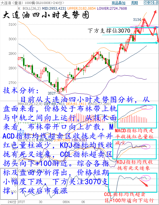 周三(8月17日)亞市早盤,因分析師對(duì)石油輸出國組織(OPEC)能否達(dá)成凍產(chǎn)協(xié)議持懷疑態(tài)度,油價(jià)盤中跌離5周高點(diǎn)。 布倫特原油期貨最新報(bào)48.85美元/桶,較上個(gè)交易日下跌38美分。盡管布油價(jià)格有所下滑,但自8月初至今油價(jià)仍漲逾17%,并仍交投于周二創(chuàng)下的5周高點(diǎn)49.36附近。 美國WTI原油期貨最新報(bào)46.30美元/桶,較上個(gè)交易日下跌28美分,但自8月初至今油價(jià)仍上漲18%左右。 交易商表示,近期油價(jià)上漲引起獲利拋盤令油價(jià)承壓,并且市場(chǎng)對(duì)OPEC能否成功控制原油供應(yīng)過剩的局面持懷疑態(tài)度。 石油輸出國組織(OPEC)方面的消息,OPEC成員國將于下個(gè)月與非OPEC產(chǎn)油國會(huì)面討論油市問題,凍產(chǎn)計(jì)劃再次浮上水面。另外,沙特阿拉伯方面表示希望進(jìn)一步提高油價(jià)。 法國巴黎銀行(BNP Paribas)表示:“受近期沙特阿拉伯能源部長近期提高油價(jià)的言論支持,OPEC成員將會(huì)共同合作提振油價(jià)的傳聞再一次席卷市場(chǎng)。” 正如大多數(shù)原油分析師一樣,法國巴黎銀行也對(duì)下個(gè)月的談話結(jié)果持懷疑態(tài)度:“從近期產(chǎn)油者合作令人失望的過往紀(jì)錄來看,我們不會(huì)屏息以待最終達(dá)成凍產(chǎn)協(xié)議,更不會(huì)對(duì)急需的減產(chǎn)以促進(jìn)油市再平衡抱有期待。” 此前,OPEC成員曾在4月17日與主要原油生產(chǎn)國(如俄羅斯等)會(huì)面,共同討論原油限產(chǎn)問題,但因沙特阿拉伯和伊朗難達(dá)凍產(chǎn)共識(shí),最終會(huì)議以失敗告終。 而OPEC成員6月的內(nèi)部會(huì)議也因難達(dá)凍產(chǎn)共識(shí)而再度落空,而此后該組織的原油產(chǎn)量又創(chuàng)歷史新高點(diǎn)。 大連油技術(shù)分析: 技術(shù)分析: 目前從大連油四小時(shí)走勢(shì)圖分析,從盤面來看,價(jià)格處于布林帶上軌與中軌之間向上運(yùn)行,從技術(shù)面來看,布林帶開口向上擴(kuò)散,MACD指標(biāo)均線超賣區(qū)收攏走平并紅色量柱減少,KDJ指標(biāo)均線收攏有死叉跡象,CCL指標(biāo)超賣區(qū)拐頭向下+100附近。綜合各指標(biāo)及盤面分析得出,價(jià)格短期小幅度下跌,下方關(guān)注3070支撐,不破后市看漲 操作建議: 今日大連油整體趨勢(shì)以逢低做多為主,以高空為輔。 日內(nèi)阻力:3160/3200 日內(nèi)支撐:3070/3040 激進(jìn)者空單3160~3170區(qū)間內(nèi)可以考慮擇機(jī)進(jìn)場(chǎng)做空,止損3200上方,目標(biāo)3130/3100。 穩(wěn)健者空單3200~3210區(qū)間內(nèi)可以考慮擇機(jī)進(jìn)場(chǎng)做空,止損3240上方,目標(biāo)3160/3130。 激進(jìn)者多單3100~3110區(qū)間內(nèi)可以考慮擇機(jī)進(jìn)場(chǎng)做多,止損3070下方,目標(biāo)3130/3160。 穩(wěn)健者多單3030~3040區(qū)間內(nèi)可以考慮擇機(jī)進(jìn)場(chǎng)做多,止損3000下方,目標(biāo)3070/3100。 以上操作建議僅供參考、投資有風(fēng)險(xiǎn)、操作需謹(jǐn)慎。 【以上建議出自中匯天融分析部,以實(shí)盤操作建議為準(zhǔn)】 再生銀技術(shù)分析: 技術(shù)分析: 目前從再生銀四小時(shí)走勢(shì)圖,從盤面來看,價(jià)格處于三角形整理形態(tài),后市突破任意方向?qū)⒀永m(xù)那個(gè)方向運(yùn)行,從技術(shù)面來看,布林帶開口有向外擴(kuò)散的跡象,價(jià)格處于布林中軌與下軌之間,MACD指標(biāo)均線粘合走平紅色量柱減少,KDJ指標(biāo)均線死叉向下運(yùn)行,CCL指標(biāo)均線拐頭向上。綜合個(gè)指標(biāo)及盤面分析得出,價(jià)格短期震蕩上漲,預(yù)計(jì)后市行情下跌。 操作建議: 今日再生銀整體趨勢(shì)以逢高做空為主,以低多為輔。 日內(nèi)阻力:4260/4290 日內(nèi)支撐:4180/4140 激進(jìn)者空單4230~4220區(qū)間內(nèi)可以考慮擇機(jī)入場(chǎng)做空,止損4260上方,目標(biāo)4180/4140。 穩(wěn)健者空單4260~4270區(qū)間內(nèi)可以考慮擇機(jī)入場(chǎng)做空,止損4290上方,目標(biāo)4230/4200。 激進(jìn)者多單4200/4190區(qū)間內(nèi)可以考慮擇機(jī)入場(chǎng)做多,止損4160下方,目標(biāo)4230/4260。 穩(wěn)健者多單4150/4140區(qū)間內(nèi)可以考慮擇機(jī)入場(chǎng)做多,止損4110下方,目標(biāo)4180/4220。 以上操作建議僅供參考、投資有風(fēng)險(xiǎn)、操作需謹(jǐn)慎。 【以上建議出自中匯天融分析部,以實(shí)盤操作建議為準(zhǔn)】 今日重點(diǎn)關(guān)注的財(cái)經(jīng)數(shù)據(jù)及事件: 00:30美聯(lián)儲(chǔ)亞特蘭大聯(lián)儲(chǔ)主席洛克哈特(Dennis Lockhart)發(fā)表講話。 04:30美國至8月12日當(dāng)周API原油庫存(萬桶) 16:30英國7月失業(yè)率 16:30英國7月失業(yè)金申請(qǐng)人數(shù)(萬人) 16:30英國6月三個(gè)月ILO失業(yè)率 17:00瑞士8月ZEW投資者信心指數(shù) 22:30美國至8月12日當(dāng)周EIA原油庫存(萬桶)【重點(diǎn)關(guān)注】 三窮三富過到老,十年興敗多少人,誰人背后無人說,誰人背后不說人!時(shí)間讓我們看清,什么是真,什么是假,喜我者,我惜之,嫌我者,我棄之。也許你很牛,但我未必在乎你,也許你啥也不是,但我不嫌棄你,你為我付出,我必對(duì)的起你,你敢在我身上賭。我會(huì)拼命讓你贏!這就是以心換心!珍惜身邊對(duì)你好的每個(gè)人! 本文僅代表王氏議金個(gè)人觀點(diǎn),不同平臺(tái)注意價(jià)格的換算,撰稿人