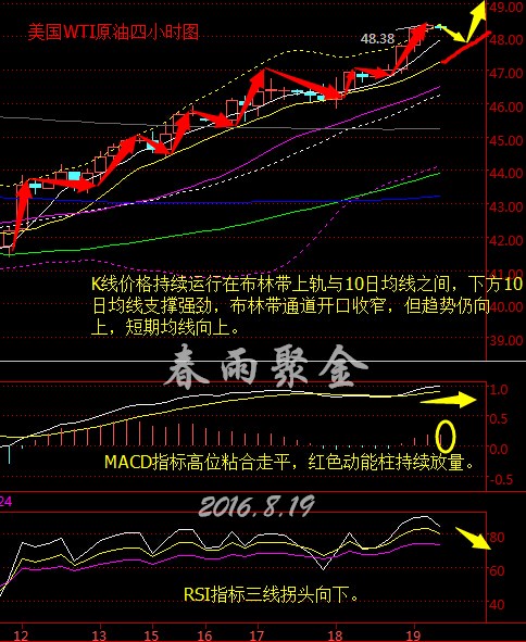 基本面分析: 美國WTI原油9月期貨周四(8月18日)收漲1.43美元,或3.06%,報48.22美元/桶,盤中最高觸及48.38美元/桶。布倫特原油10月期貨周四收漲1.04美元,或2.09%,報50.89美元/桶,盤中最高觸及51.05美元/桶。 截至周四收盤,美油自8月初低點已累計反彈22%,本周已錄得逾8%漲幅,若今日能延續漲勢,則將錄得四個月來最大周度漲幅。 近期公布的美聯儲7月會議紀要及美國經濟數據良莠不齊,美元指數延續跌勢仍徘徊在自英國脫歐公投以來低位。 雖然隔夜公布的截至8月13日當周首次申請失業救濟人數減少4000人,降至26.2萬人,創下一個月以來最低水平,但費城聯儲8月新訂單指數,以及就業分項全線暴跌,尤其是就業分項指數更是創下7年以來的低位。美元承壓回落為油價提供了一定支撐。 目前,短期內油市缺少基本面利空消息,投資者暫時只需要警惕多頭獲利離場及沖高回落風險。另外,次日凌晨公布的上周美國活躍石油鉆井數同樣需要關注。 技術面分析: 美國WTI原油從四小時走勢圖來看,K線價格持續運行在布林帶上軌與10日均線之間,下方10日均線支撐強勁,布林帶通道開口收窄,但趨勢仍向上,短期均線向上。 附圖MACD指標高位粘合走平,紅色動能柱持續放量;RSI指標三線拐頭向下。 綜合來看,短線上漲動能不足,預計短線有小幅回調,早盤時段建議回調至低位介入多單。 8.19美原油操作策略:逢低做多即可。 47.7美元附近做多,目標看向48.8美元,止損在47.5美元下方; 48.7附近做空,目標看向48美元附近,止損0.2美元。 支撐、阻力點位分析: 美元指數 第一支撐:94.10;第二支撐:94.00; 第一阻力:94.40;第二阻力:94.50; 現貨黃金(美元/盎司) 第一支撐:1342;第二支撐:1336; 第一阻力:1353;第二阻力:1356; 現貨白銀(美元/盎司) 第一支撐:19.50;第二支撐:19.35; 第一阻力:19.75;第二阻力:19.90; 交易非多即空,非空即多,多空的博弈是利潤的二次分配,也是財富的重新規劃。 作多被殺?作空被軋?而我們自立一派,贏在“多空”,在專業中彰顯靈動,于智慧中成就財富 ! (以上文章由本人春雨撰寫,轉載請注明出處,溫馨提示:投資有風險,入市需謹慎,建議僅供參考!) |