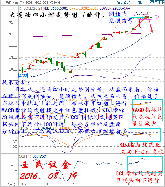 周五(8月19日)原油盤初,美油小幅上漲,交投于48.25美元/桶附近,漲幅約為0.06%;布油小幅下跌,交投于50.76美元/桶附近,跌幅約為0.26%。凍產(chǎn)預(yù)期,空頭回補(bǔ)及美元走強(qiáng)等因素促使近期油價(jià)不斷上漲,但是,凍產(chǎn)前沙特8月原油產(chǎn)量創(chuàng)新高,令市場(chǎng)對(duì)凍產(chǎn)心存疑慮。再加之供需面上,原油和成品油庫(kù)存高企的現(xiàn)狀尚未改變,市場(chǎng)交投仍需謹(jǐn)慎。周四OPEC凍產(chǎn)預(yù)期的持續(xù)發(fā)酵,加之美元的持續(xù)下跌助推油價(jià)上漲,美油連續(xù)六日收漲,且布倫特原油六周來首次升穿50美元。 從供需面上看,美國(guó)煉油廠的原油需求在第四季度可能會(huì)下滑,因?yàn)槟菚r(shí)候?qū)⑦M(jìn)入煉油設(shè)備的常規(guī)維護(hù)期。上周美國(guó)石油儲(chǔ)備凈增加130萬桶表明市場(chǎng)供應(yīng)過剩問題仍然很嚴(yán)重。在市場(chǎng)恢復(fù)健康平衡之前,原油供應(yīng)過剩導(dǎo)致的庫(kù)存高企壓力需要被消化掉。從消息面上看,國(guó)際能源論壇將于9月26日-28日在阿爾及利亞舉行。OPEC可能在下個(gè)月與非OPEC產(chǎn)油國(guó)會(huì)晤時(shí)恢復(fù)凍產(chǎn)磋商,委內(nèi)瑞拉再次呼吁凍產(chǎn),沙特表示支持價(jià)格支撐舉措。俄羅斯和OPEC能源官員在維也納進(jìn)行了會(huì)晤,討論了油市。這些利好消息持續(xù)發(fā)酵,令凍產(chǎn)預(yù)期不斷升溫,緩解了市場(chǎng)對(duì)于油價(jià)再一次瀕臨暴跌邊緣的恐懼,美油和布油從8月初觸及的低位已經(jīng)上漲逾20%。 大連油技術(shù)分析: 技術(shù)分析: 目前從大連油四小時(shí)走勢(shì)圖分析,從盤面來看,價(jià)格在頂部形成倒錘頭,見頂信號(hào)。從技術(shù)面來看,價(jià)格處于布林帶中軌與上軌之間,布林帶開口向上運(yùn)行,MACD指標(biāo)均線收攏走平紅色量柱減少KDJ指標(biāo)均線死叉向下運(yùn)行發(fā)散,CCL指標(biāo)均線超買區(qū)拐頭向下運(yùn)行+100附近,綜合各指標(biāo)及盤面分析得出,下方關(guān)注3200,不破后市繼續(xù)看多。 操作建議: 今晚大連油整體操作思路以逢低做多為主,以高空為輔。 日內(nèi)阻力:3250/3280 日內(nèi)支撐:3200/3160 激進(jìn)者空單3230~3240區(qū)間內(nèi)可以考慮擇機(jī)入場(chǎng)做空,止損3270上方,目標(biāo)3200/3160。 穩(wěn)健者空單3270~3280區(qū)間內(nèi)可以考慮擇機(jī)入場(chǎng)做空,止損3300上方,目標(biāo)3240/3210。 激進(jìn)者多單3190~3200區(qū)間內(nèi)可以考慮擇機(jī)入場(chǎng)做多,止損3160下方,目標(biāo)3230/3260。 穩(wěn)健者多單3160~3170區(qū)間內(nèi)可以考慮擇機(jī)入場(chǎng)做多,止損3130下方,目標(biāo)3200/3240。 以上操作建議僅供參考、投資有風(fēng)險(xiǎn)、操作需謹(jǐn)慎。 【以上建議出自中匯天融分析部,以實(shí)盤操作建議為準(zhǔn)】 再生銀技術(shù)分析: 技術(shù)分析: 目前從再生銀四小時(shí)走勢(shì)圖分析,從盤面來看,價(jià)格向下運(yùn)行破位下方支撐,布林帶開口向外擴(kuò)散,預(yù)計(jì)后市行情下跌,上方關(guān)注4200,反彈不破,后市看空,從技術(shù)面來看,MACD指標(biāo)均線死叉向下運(yùn)行綠色量柱增加,KDJ指標(biāo)均線死叉向下運(yùn)行發(fā)散,CCL指標(biāo)均線向下運(yùn)行超賣區(qū)走平,綜合各指標(biāo)及盤面分析得出,價(jià)格短期震蕩上漲,預(yù)計(jì)后市行情下跌。 操作建議: 今晚再生銀整體趨勢(shì)以逢高做空為主,以低多為輔。 日內(nèi)阻力:4200/4250 日內(nèi)支撐:4150/4130 激進(jìn)者空單4180~4170區(qū)間內(nèi)可以考慮擇機(jī)入場(chǎng)做空,止損4210上方,目標(biāo)4140/4100。 穩(wěn)健者空單4220~4210區(qū)間內(nèi)可以考慮擇機(jī)入場(chǎng)做空,止損4250上方,目標(biāo)4170/4130。 激進(jìn)者多單4150~4140區(qū)間內(nèi)可以考慮擇機(jī)入場(chǎng)做多,止損4110下方,目標(biāo)4190/4220。 穩(wěn)健者空單4100~4110區(qū)間內(nèi)可以考慮擇機(jī)入場(chǎng)做多,止損4070下方,目標(biāo)4150/4190。 以上操作建議僅供參考、投資有風(fēng)險(xiǎn)、操作需謹(jǐn)慎。 【以上建議出自中匯天融分析部,以實(shí)盤操作建議為準(zhǔn)】 三窮三富過到老,十年興敗多少人,誰人背后無人說,誰人背后不說人!時(shí)間讓我們看清,什么是真,什么是假,喜我者,我惜之,嫌我者,我棄之。也許你很牛,但我未必在乎你,也許你啥也不是,但我不嫌棄你,你為我付出,我必對(duì)的起你,你敢在我身上賭。我會(huì)拼命讓你贏!這就是以心換心!珍惜身邊對(duì)你好的每個(gè)人! 本文僅代表王氏議金個(gè)人觀點(diǎn),不同平臺(tái)注意價(jià)格的換算,撰稿人:王氏議金! |