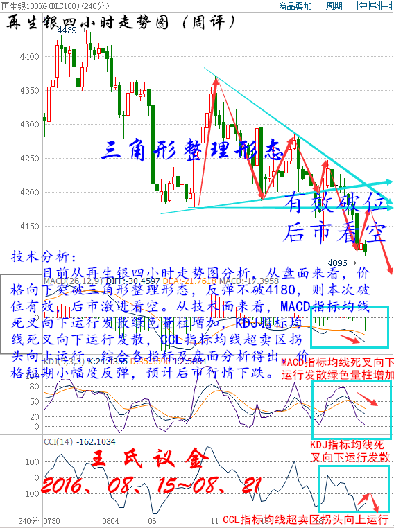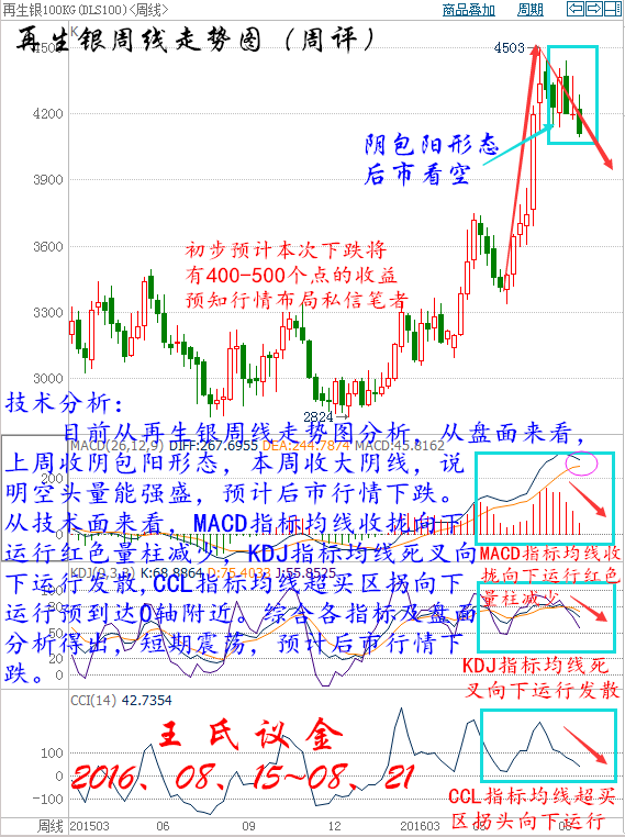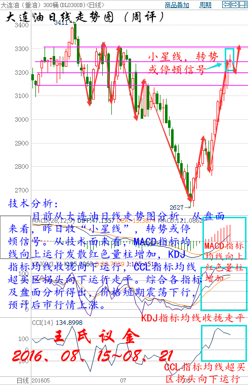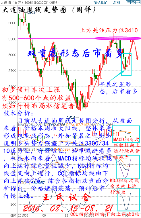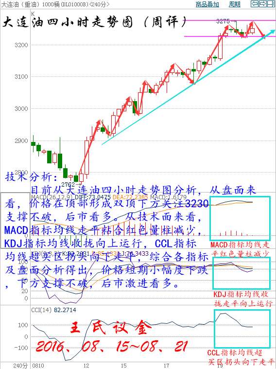 拖延才是最徹底的拒絕,看似還留有一絲期望,其實(shí)說白了,不僅不認(rèn)真,還懶得解釋為什么要認(rèn)真。6年多一路的堅(jiān)持,或許為此失去了不少,選擇了孤獨(dú)就不需要給人解釋為何寂寞,堅(jiān)持不就因?yàn)閬碜怨亲永锏臒釔。不需要要求每個(gè)人都變成另一個(gè)自已,想著放棄多容易,比日復(fù)一日的努力容易多了,不是所有人都想創(chuàng)造一個(gè)破釜沉舟的故事!投資同樣是一個(gè)自我造夢和圓夢的過程! 請給自己十分鐘看完本文,謝謝!☟☟☟☟☟ 我希望自己可以成為你投資路上的貴人,幫助你。我這個(gè)人比較心軟,看到有些別的老師帶的客戶因?yàn)樘濆X各種傷心失望,對(duì)這個(gè)市場失去信心,心里挺不是滋味,但是我又不能直接把投資虧損的你搶過來,跟你說我很牛,我可以幫到你,我沒有辦法讓你直接相信我,靠我這一張笨嘴我是沒有能力的。所以相信緣分是對(duì)的。如果你是新手,我也可以成為你投資路上的引路人,讓你的投資路更明朗。事實(shí)可以證明我是對(duì)的! 美國WTI原油9月期貨周五(8月19日)收漲0.30美元,或0.62%,報(bào)48.52美元/桶,本周大漲10.18%。布倫特原油10月期貨周五收跌0.01美元,或0.02%,報(bào)50.88美元/桶,本周勁升8.11%。雖然美國本周石油活躍鉆井?dāng)?shù)再度大增,同時(shí)投資者鎖定獲利也另油價(jià)承受一定壓力,但限產(chǎn)押注的提振效果依然存在,油價(jià)日內(nèi)基本持平。美國WTI原油期貨價(jià)格盤中最高觸及48.74美元/桶,布倫特原油期貨價(jià)格盤中最高觸及51.22美元/桶。 本周行情回顧: 周一(8月15日)亞歐時(shí)段國際油價(jià)小幅沖高,美原油9月期貨一度刷新三周高點(diǎn)至45.13美元/桶,布倫特原油10月期貨最高觸及47.60美元/桶,圍繞OPEC可能凍產(chǎn)的臆測使得空頭回補(bǔ)加上,給油價(jià)提供了上漲動(dòng)能,美油上方關(guān)注7月15日高點(diǎn)47.05美元附近的阻力,不過鑒于市場普遍預(yù)期凍產(chǎn)會(huì)再次落空,油價(jià)仍隨時(shí)面臨空頭反撲的可能。澳新銀行(ANZ)周一表示,因圍繞石油輸出國組織(OPEC)可能采取凍產(chǎn)措施的臆測升溫,油價(jià)再次上漲。沙特阿拉伯表示準(zhǔn)備在下個(gè)月的OPEC非正式會(huì)議上討論穩(wěn)定市場議題。 周二(8月16日)原油盤初,油價(jià)小幅回落。美油交投于45.62美元/桶附近,跌幅約為0.26%;布油交投于48.19美元/桶附近,跌幅約為0.33%。多頭獲利了結(jié),致使油價(jià)短期內(nèi)小幅回落。OPEC凍產(chǎn)預(yù)期或降溫,API庫存數(shù)據(jù)公布前,市場交投謹(jǐn)慎。因俄羅斯愿與OPEC共同商討穩(wěn)定油價(jià)的措施,委內(nèi)瑞拉原油產(chǎn)量創(chuàng)14年最大跌幅等消息的刺激,油價(jià)大幅上漲。周一美元走勢疲軟,對(duì)油價(jià)也起一定的支撐。油價(jià)周一觸及五周高位,三日連升累積升幅達(dá)到10%或以上。 周三(8月17日)原油盤初,油價(jià)小幅回落。美油交投于46.42美元/桶附近,跌幅約為0.34%;布油交投于48.96美元/桶附近,跌幅約為0.55%。雖然OPEC凍產(chǎn)預(yù)期升溫,加之美元走軟,尼日利亞減產(chǎn)等因素提振市場樂觀情緒,但是,API公布的數(shù)據(jù)顯示,成本油庫存意外大增,這令處在油價(jià)高位的原油多頭頓感緊張,市場交投謹(jǐn)慎,晚間將要公布的EIA數(shù)據(jù)或再掀油市風(fēng)雨。周二(8月16日)美國WTI 9月原油期貨價(jià)格收盤上漲0.67美元,漲幅1.89%,報(bào)46.41美元/桶。OPEC凍產(chǎn)前景和疲軟美元助油價(jià)觸及五周高位,尼日利亞日產(chǎn)量由于軍事襲擊和管道問題減少逾70萬桶同樣給油價(jià)帶來支撐。 周四(8月18日)原油盤初,油價(jià)小幅回落。美油交投于46.75美元/桶附近,跌幅約為0.09%;布油交投于49.69美元/桶附近,跌幅約為0.32%。EIA原油庫存和汽油庫存意外大減,加之美元走軟提振市場樂觀情緒。但OPEC產(chǎn)油國近期加速增產(chǎn),令市場對(duì)OPEC凍產(chǎn)心存疑慮,原油多頭近期獲利了結(jié),也令油價(jià)承壓。。美油連續(xù)第五日收漲,受助于美元下跌,美國原油庫存意外減少和汽油庫存降幅大于預(yù)期,但交易商表示,沙特產(chǎn)量急升和技術(shù)因素,將可能使油價(jià)漲勢難以持續(xù)。 周五(8月19日)歐市盤初,油價(jià)小幅回落,WTI原油跌幅0.38%至48.74美元/桶,布倫特原油跌幅0.69%至50.54美元/桶,隔夜日線均錄得六連陽。產(chǎn)油國有望協(xié)商凍產(chǎn),美國原油庫存下滑超預(yù)期,市場情緒改善持續(xù)推升油價(jià)。周五投資者關(guān)注美國石油鉆井?dāng)?shù)據(jù)。進(jìn)入8月以來油價(jià)漲勢迅猛,WTI原油已累計(jì)上漲逾19%,布倫特原油累計(jì)上漲逾18%,油價(jià)的表現(xiàn)超出了許多分析師的預(yù)期。OPEC及非OPEC產(chǎn)油國可能在9月下旬商討凍產(chǎn)的消息點(diǎn)燃了多頭的熱情,加之美國EIA及API原油庫存降幅也均超市場預(yù)期,利好不斷,油價(jià)節(jié)節(jié)攀升。 不管第一感覺怎么樣。都應(yīng)該給對(duì)方一個(gè)了解的機(jī)會(huì),我相信,你能看完這么多字,就是緣分。投資合作也是多半看緣分,如果你相信緣分,相信我可以用心為你做點(diǎn)什么,你可以試著和我交流一下,不管你新手,還是有老師。沒有誰能陪你走到天涯海角,也許哪一天你就需要我了呢? 大交所技術(shù)分析: 技術(shù)分析: 目前從大連油四小時(shí)走勢圖分