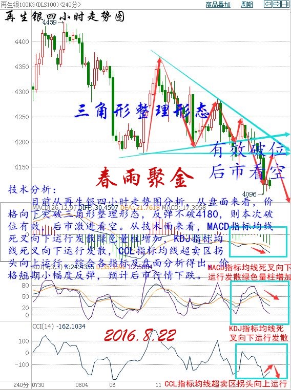 基本面利好因素: 美國能源信息署(EIA)數據顯示,截至8月12日當周美國原油庫存減少250.8萬桶,市場預估為增加52.2萬桶。美國EIA原油庫存結束連續(xù)三周的增長趨勢,并錄得7月8日當周以來最大降幅。美國上周汽油庫存減少272.4萬桶,市場預估為減少163.8萬桶,創(chuàng)下四周以來最大降幅。同時庫欣庫存減少72.4萬桶,為兩周以來最大降幅。不過上周美國國內原油產量增加15.2萬桶至859.7萬桶/日,但依然連續(xù)19周維持在900萬桶/日關口下方。此外,美國精煉油庫存增加193.9萬桶,市場預估為減少74.2萬桶,為九周以來最大增幅。 大連油技術分析: 技術分析: 目前從大連油日線走勢圖分析,從盤面來看,昨日收“小星線”,轉勢或停頓信號。從技術面來看,MACD指標均線向上運行發(fā)散紅色量柱增加,KDJ指標均線收攏向下運行,CCL指標均線超買區(qū)拐頭向下運行走平。綜合各指標及盤面分析得出,價格短期震蕩下行,預計后市行情上漲。 操作建議: 今日大連油整體趨勢以逢低做多為主,以高空為輔。 日內阻力:3280/3330 日內支撐:3220/3180 激進者空單3250~3260區(qū)間內可以考慮擇機入場做空,止損3290上方,目標3220/3180。 穩(wěn)健者空單3300~3290區(qū)間內可以考慮擇機入場做空,止損3330上方,目標3270/3230。 激進者多單3220~3210區(qū)間內可以考慮擇機入場做多,止損3170下方,目標3250/3280。 穩(wěn)健者多單3180~3170區(qū)間內可以考慮擇機入場做多,止損3140下方,目標3220/3250。 以上操作建議僅供參考、投資有風險、操作需謹慎。 再生銀技術分析: 操作建議: 今日再生銀整體趨勢以逢高做空為主,以低多為輔。 日內阻力:4140/4170 日內支撐:4050/4000 激進者空單4110~4120區(qū)間內可以考慮擇機入場做空,止損4150上方,目標4080/4050。 穩(wěn)健者空單4140~4150區(qū)間內可以考慮擇機入場做空,止損4180上方,目標4100/4050。 穩(wěn)健者多單4050~4060區(qū)間內可以考慮擇機入場做多,止損4020下方,目標4090/4120。 激進者多單4080~4090區(qū)間內可以考慮擇機入場做多,止損4050下方,目標4120/4150。 (以上文章由春雨原創(chuàng),轉載請注明出處。溫馨提示,投資有風險,入市需謹慎。以上僅代表春雨個人觀點,不作操作依據,據此操作風險自擔) |