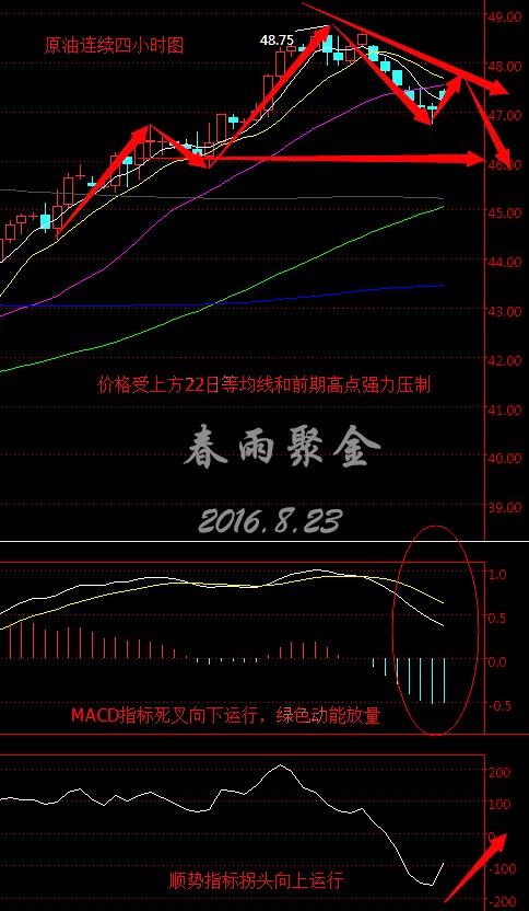 原油連續(xù)從四小時走勢圖來看,5日均線向下貫穿10日均線形成死叉且繼續(xù)向下運(yùn)行,K線價格沿5日均線震蕩下行,一度跌穿47美元隨后回升,目前價格在47美元上方徘徊。 MACD指標(biāo)在零軸上方繼續(xù)死叉向下運(yùn)行,綠色動能柱不斷放量,CCI順勢指標(biāo)拐頭向上運(yùn)行。綜合來看,K線價格受上方22日等均線和前期高點(diǎn)強(qiáng)力壓制,下跌動能較足,預(yù)計今日早盤油價將震蕩下行。 8.23美原油操作策略: 今日操作上建議高拋低吸,47.70美元左右做空,46美元附近做多。(以上建議僅供參考,風(fēng)險自擔(dān)) 支撐、阻力點(diǎn)位分析: 美元指數(shù) 第一支撐:94.40;第二支撐:94.20; 第一阻力:94.50;第二阻力:94.60; 現(xiàn)貨黃金(美元/盎司) 第一支撐:1336;第二支撐:1334; 第一阻力:1342;第二阻力:1346; 現(xiàn)貨白銀(美元/盎司) 第一支撐:18.80;第二支撐:18.70; 第一阻力:19.00;第二阻力:19.10; (以上文章由春雨原創(chuàng),轉(zhuǎn)載請注明出處。溫馨提示,投資有風(fēng)險,入市需謹(jǐn)慎。以上僅代表春雨個人觀點(diǎn),不作操作依據(jù),據(jù)此操作風(fēng)險自擔(dān)) |