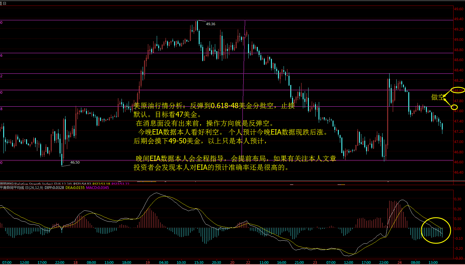 肖禮勇:8.24午間寧貴瀝青.美原油行情分析 昨日行情再次如預(yù)期發(fā)生,價(jià)格下破48一線,短期震蕩下行,觸及46.6美元反彈上行,基本上走的是震蕩行情。但晚間因伊朗發(fā)出積極信號(hào),稱其或?qū)⒅С謿W佩克的聯(lián)合行動(dòng),以支撐油市。油價(jià)瞬間從46.6美元附近飆升,突破48美元關(guān)口。同時(shí)將日?qǐng)D轉(zhuǎn)換成陽(yáng)線。收復(fù)性的反彈,這波反彈短暫終結(jié)了回調(diào)行情。綜合來(lái)看,油價(jià)在經(jīng)歷連續(xù)脫離技術(shù)面支撐大漲之后,目前消息面出現(xiàn)利空因素,油價(jià)外強(qiáng)中干的一面立刻原形畢露,對(duì)應(yīng)到日內(nèi)的操作思路.消息面沒出來(lái)前,高空為主。 |