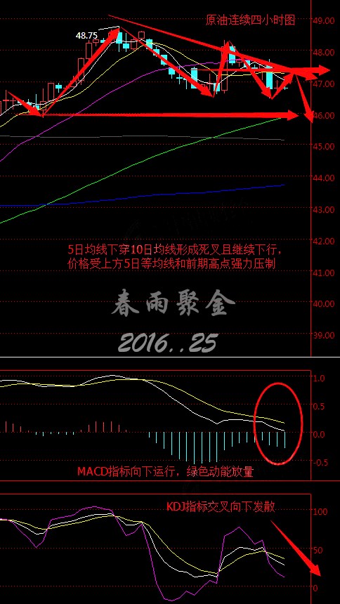 原油連續從四小時走勢圖來看,5日、10日、22日等均線拐頭向下運行,5日均線向下貫穿10日均線形成死叉且繼續下行,K線價格沿5日均線震蕩下行,目前價格在46.50美元上方整理。 MACD指標在零軸上方向下運行且觸碰零軸,綠色動能柱不斷放量,KDJ指標交叉向下發散。綜合來看,K線價格受上方5日等均線和前期高點強力壓制,下跌但較足,預計今日早盤油價將震蕩下行。 8.25美原油操作策略: 今日操作上建議逢高做空,47.20美元左右做空,46美元附近做多。(以上建議僅供參考,風險自擔) 支撐、阻力點位分析: 美元指數 第一支撐:94.40;第二支撐:94.20; 第一阻力:94.50;第二阻力:94.60; 現貨黃金(美元/盎司) 第一支撐:1320 ; 第二支撐:1315; 第一阻力:1330 ; 第二阻力:1333. 現貨白銀(美元/盎司) 第一支撐:18.20;第二支撐:18.00; 第一阻力:18.90;第二阻力:19.10; 今日重點關注數據: 16:00 德國8月IFO商業景氣指數、商業預期指數 20:30 美國7月耐用品訂單環比 20:30 美國8月20日當周首次申請失業救濟人數 (以上文章由春雨原創,轉載請注明出處。溫馨提示,投資有風險,入市需謹慎。以上僅代表春雨個人觀點,不作操作依據,據此操作風險自擔) |