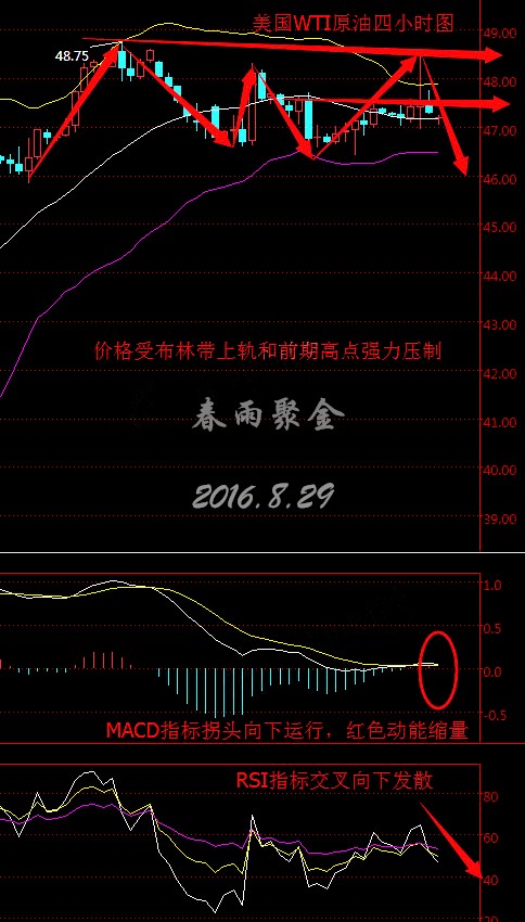 原油連續從四小時走勢圖來看,布林帶整體走緩,上、中、下三軌相對走平,K線價格自中軌處受支撐強勢上行,一度突破上軌,隨后受前期高點壓制下行觸碰中軌,目前價格在47美元上方徘徊。 MACD指標在零軸上方拐頭向下運行,預計將形成死叉,紅色動能不斷縮量,RSI指標交叉向下發散。綜合來看,K線價格受布林帶上軌和前期高點強力壓制,下跌但較足,預計今日早盤油價將震蕩下行。 8.29今日美原油操作策略: 操作上建議逢高做空,47.50美元左右做空,46美元附近做多。(以上建議僅供參考,風險自擔) 關鍵阻力位及支撐位分析: 現貨黃金(美元/盎司):逢高做空 第一支撐:1315 ; 第二支撐:1310 ; 第一阻力:1325 ; 第二阻力:1330 . 現貨白銀(美元/盎司):逢高做空 第一支撐:18.40 ; 第二支撐:18.20 ; 第一阻力:18.60 ; 第二阻力:18.70 . 今日重點關注數據:(8.29星期一) 20:30 美國7月個人支出月率 20:30 美國7月PCE物價指數月率 22:30 美國8月達拉斯聯儲商業活動指數 本文作者系CFP注冊理財規劃師,多年從事金融領域相關工作,對現貨大宗商品有豐富的實戰經驗。微信:chunyujujin (以上文章由春雨原創,轉載請注明出處。溫馨提示,投資有風險,入市需謹慎。以上僅代表春雨個人觀點,不作操作依據,據此操作風險自擔) |