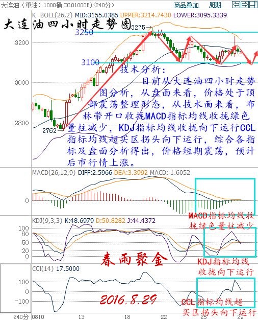 不管第一感覺怎么樣。都應該給對方一個了解的機會,我相信,你能看完這么多字,肯定是想在這個市場里能穩健獲利。我相信你能在這個投資市場上堅持這么久就是為了賺錢,為了能在投資市場里能穩健獲利,而我不說有多么厲害,多么牛逼,但是我能給你證明的是實力見證一切,實力讓你知道我是你的投資道路上的引路人,是你的投資上的為你指明方向,是你的投資人生上的必不可失的一位重要角色,為什么我能有這么自信的給你說,只因為我有這個實力,不信你可以一試,信我者的的天下! 上周收盤: 美國WTI原油10月期貨周五(8月26日)收漲0.31美元,或0.65%,報47.64美元/桶,本周下挫3.48%。布倫特原油10月期貨周五收漲0.25美元,或0.50%,報49.92美元/桶,本周下跌2.26%。美聯儲主席耶倫和副主席費希爾的講話提振了年內加息預期,同時也為9月加息保留了可能,這令美元強勢反彈,不過美國本周石油活躍鉆井數持平于上周,終結了連續八周的漲勢,為原油多頭帶來一定的信心。美國WTI原油期貨價格盤中最高觸及48.45美元/桶,布倫特原油期貨價格盤中最高觸及50.75元/桶。 大交所大連油技術分析: