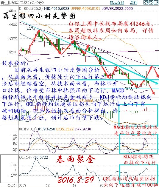 技術分析: 目前從大連油四小時走勢圖分析,從盤面來看,價格處于頂部震蕩整理形態,從技術面來看,布林帶開口收攏MACD指標均線收攏綠色量柱減少,KDJ指標均線收攏向下運行CCL指標均線超買區拐頭向下運行,綜合各指標及盤面分析得出,價格短期震蕩,預計后市行情上漲。 操作建議: 今日大連油整體操作趨勢以逢低做多為主,以高空為輔。 日內阻力:3185/3220 日內支撐:3120/3080 激進者空單3150~3160區間內可以考慮擇機入場做空,止損3185上方,目標3120/3100。 穩健者空單3185~3195區間內可以考慮擇機入場做空,止損3225上方,目標3150/3120。 激進者多單3120~3110區間內可以考慮擇機入場做多,止損3090下方,目標3150/3180。 穩健者多單3080~3070區間內可以考慮擇機入場做多,止損3040下方,目標3120/3150。 我寫這篇解析也是希望能遇到我的有緣人。我希望自己可以成為你投資路上的貴人,幫助你。我這個人比較心軟,看到有些別的老師帶的客戶因為虧錢各種傷心失望,對這個市場失去信心,心里挺不是滋味,但是我又不能直接把投資虧損的你搶過來,跟你說我很牛,我可以幫到你,我沒有辦法讓你直接相信我,靠我這一張笨嘴我是沒有能力的。如果你是新手,我也可以成為你投資路上的引路人,讓你的投資路更明朗。 大交所再生銀技術分析:
