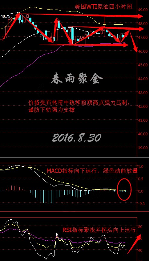 今日分析策略: 美國WTI原油10月期貨周一(8月29日)收跌0.66美元,或1.39%,報46.98美元/桶。布倫特原油10月期貨周一收跌0.66美元,或1.32%,報49.26美元/桶。 原油市場基本面不容樂觀,供應(yīng)過剩憂慮重燃,尼日利亞恢復(fù)產(chǎn)量,伊拉克、伊朗以及阿聯(lián)酋等國家不斷增產(chǎn),再加上原油需求見頂?shù)募竟?jié)逐漸過去,這些使得油價持續(xù)承壓下行。 同時,美聯(lián)儲官員頻發(fā)鷹派講話以及個人消費指出數(shù)據(jù)向好令美元延續(xù)漲勢,油價繼續(xù)承壓下挫。 不過,據(jù)看到Genscape數(shù)據(jù)的交易員稱,截至8月26日當(dāng)周,庫欣原油庫存減少28.7444萬桶。庫存減少的預(yù)期限制了油價的跌幅。 目前,市場聚焦美國石油學(xué)會(API)將于北京時間周三(8月31日)04:30公布原油庫存數(shù)據(jù),上周API原油庫存大增,油價一度承壓下行。 技術(shù)面分析: 美國WTI原油從四小時走勢圖來看,布林帶整體走緩且開口收攏跡象明顯,上軌和中軌拐頭向下,下軌則向上運行,K線價格自下軌處受支撐上行,觸及中軌并受其壓制,目前價格在47美元附近整理。 MACD指標向下運行并突破零軸,綠色動能柱仍在放量,RSI指標聚攏并拐頭向上運行。綜合來看,K線價格受布林帶中軌和前期高點強力壓制,謹防下軌強力支撐,預(yù)計今日早盤油價將小幅上揚再震蕩下行。 8.30美原油操作策略: 今日操作上建議逢高做空,47.50美元左右做空,46美元附近做多。(以上建議僅供參考,風(fēng)險自擔(dān)) 現(xiàn)貨白銀從四小時走勢圖來看,布林帶整體走緩且開口收攏,K線價格自下軌處受支撐上行突破中軌,觸及上軌并受其壓制下行,目前價格在18.80上方徘徊。下方MACD指標繼續(xù)向上運行,紅色動能柱不斷放量。綜合來看,K線價格受布林帶中軌強力支撐,但短期受上軌和前期高點強力壓制,上漲動能較不足,預(yù)計今日早盤銀價將小幅回落再震蕩上行。 現(xiàn)貨白銀(美元/盎司):高拋低吸 第一支撐:18.70;第二支撐:18.65; 第一阻力:18.85;第二阻力:18..95. 今日重點關(guān)注數(shù)據(jù): 17:00歐元區(qū)8月經(jīng)濟景氣指數(shù) 17:00歐元區(qū)8月消費者信心指數(shù)終值 20:00德國8月CPI同比初值 22:00美國8月諮商會消費者信心指數(shù) (以上文章由春雨原創(chuàng),轉(zhuǎn)載請注明出處。溫馨提示,投資有風(fēng)險,入市需謹慎。以上僅代表春雨個人觀點,不作操作依據(jù),據(jù)此操作風(fēng)險自擔(dān)) |