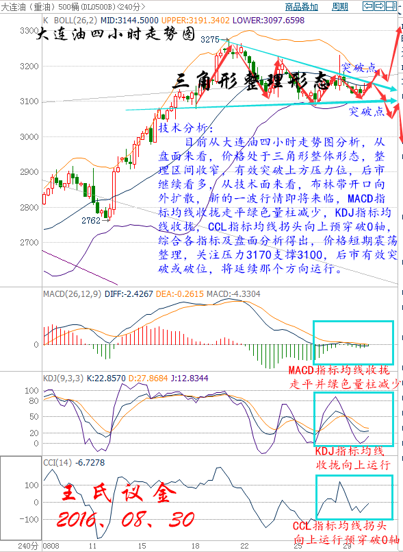 昨日收盤: 美國WTI原油10月期貨周一(8月29日)收跌0.66美元,或1.39%,報46.98美元/桶。布倫特原油10月期貨周一收跌0.66美元,或1.32%,報49.26元/桶。美聯(lián)儲官員頻發(fā)鷹派講話以及個人消費(fèi)指出數(shù)據(jù)向好令美元延續(xù)漲勢,油價承壓下挫,同時中東地區(qū)原油產(chǎn)量持續(xù)上升加重了投資者對油市基本面的擔(dān)憂。美國WTI原油期貨價格盤中最低觸及46.62美元/桶,布倫特原油期貨價格盤中最低觸及49.16元/桶。 基本面利好因素: 能源情報監(jiān)測機(jī)構(gòu)Genscape數(shù)據(jù)顯示,截至8月26日一周,美國原油主要交割地庫欣地區(qū)庫存減少28.7444萬桶。 美國油服公司貝克休斯(Baker Hughes)周五(8月26日)公布數(shù)據(jù)顯示,截至2016年8月26日當(dāng)周美國石油活躍鉆井?dāng)?shù)持平于406座,結(jié)束了八周連漲。美國當(dāng)周天然氣活躍鉆井?dāng)?shù)減少2座至81座。截至8月26日當(dāng)周美國石油和天然氣活躍鉆井總數(shù)減少2座至489座,較去年同期減少388座。 熟悉內(nèi)部情況的消息人士今日指出,雖然目前尚未得知9月會議上產(chǎn)油國之間將討論何種產(chǎn)量限制方案,但伊朗方面已經(jīng)釋放出了積極信號,一方面愿意參加此次會談,另一方面或進(jìn)一步支持產(chǎn)油國之間達(dá)成的合作協(xié)議,這為原油多頭注入了一劑強(qiáng)心針。 基本面利空因素: 因?qū)ζ嚨男枨髲?qiáng)勁,美國7月消費(fèi)者支出連續(xù)第四個月上漲,直指經(jīng)濟(jì)加速增長,可能為美聯(lián)儲今年升息鋪平道路。美聯(lián)儲主席耶倫周五在杰克遜霍爾舉行的全球央行行長會議上表示,因就業(yè)市場與經(jīng)濟(jì)總體狀況有所改善,近幾個月加息的可能性增強(qiáng)。不過,她未給出具體加息時機(jī)線索。但美聯(lián)儲副主席費(fèi)希爾在耶倫講話之后表示,主席耶倫日內(nèi)稍早的講話與今年加息預(yù)期一致,意味著9月可能加息。在美聯(lián)儲官員鷹派言論之后,交易員押注美聯(lián)儲加息概率大幅攀升。9月加息的概率大幅攀升至44%,12月加息的概率攀升至64.9%。今日美元指數(shù)延續(xù)上周五漲勢,觸及兩周高位95.84。美元走強(qiáng)令油價承壓。 美國能源信息署(EIA)數(shù)據(jù)顯示,截至8月19日當(dāng)周美國原油庫存增加250.1萬桶,市場預(yù)估為減少45.5萬桶,創(chuàng)下4月29日當(dāng)周以來最大增幅。美國原油交割地庫欣庫存增加37.5萬桶,為8月5日當(dāng)周以來最大增幅。美國上周汽油庫存增加3.6萬桶,市場預(yù)估為減少116.6萬桶,連續(xù)三周的下滑趨勢戛然而止。此外,美國精煉油庫存增加12.2萬桶,市場預(yù)估為增加40.0萬桶,為連續(xù)兩周錄得增加,且上周美國精煉油庫存上升至2011年以來同期最高水準(zhǔn)。 尼日利亞尼日爾三角洲復(fù)仇者武裝組織發(fā)布聲明表示,已停止在尼日爾三角洲地區(qū)的敵對行動。該組織之前曾宣稱,對過去數(shù)月內(nèi)尼日爾三角洲地區(qū)數(shù)個油氣設(shè)施的襲擊事件負(fù)責(zé)。這則消息顯著改善了市場對該國原油產(chǎn)量形勢的擔(dān)憂情緒。 伊拉克北部國營石油公司(NOC)石油和能源委員會成員Fouad Hussein上周日(8月21日)在電話中稱,隨著Baba Gorgor, Jambour以及Khabbaz油田出口的恢復(fù),伊拉克的總原油出口將增加約15萬桶/日。此前這三座油田由NOC運(yùn)營,但其用于出口的油管則被半自治的的庫爾德斯坦地區(qū)政府(KRG)控制。 中國海關(guān)公布的數(shù)據(jù)顯示,中國7月柴油出口同比暴增181.8%,達(dá)到153萬噸,是2015年平均單月出口量的近三倍。汽油出口同比勁升145%,至97萬噸,略低于6月的紀(jì)錄高位110萬噸。此外,煤油出口同比跳升46%至109萬噸。這令市場煉油產(chǎn)品利潤承受重壓,恐加重?zé)捰彤a(chǎn)品的供應(yīng)過剩問題。 華益金安天然氣技術(shù)分析: 技術(shù)分析: 目前從天然氣兩小時走勢圖,從盤面來看,價格處于上升趨勢,受下方支撐反彈向上運(yùn)行,從技術(shù)面來看布林帶開口向上運(yùn)行MACD指標(biāo)均線死叉向下運(yùn)行,RSI指標(biāo)均線收攏走平,KDJ指標(biāo)均線收攏走平,綜合各指標(biāo)及盤面分析得出,價格短期小幅度回落,預(yù)計后市行情上漲。 操作建議: 今日天然氣整體操作趨勢以逢低做多為主,以高空為輔。 日內(nèi)阻力:4880/4920 日內(nèi)支撐:4830/4800 激進(jìn)者空單4880~4890區(qū)間內(nèi)可以考慮擇機(jī)入場做空,止損4920上方,目標(biāo)4850/4830。 穩(wěn)健者空單4910~4920區(qū)間內(nèi)可以考慮擇機(jī)入場做空,止損4950上方,目標(biāo)4880/4850。 激進(jìn)者多單4830~4820區(qū)間內(nèi)可以考慮擇機(jī)入場做多,止損4790下方,目標(biāo)4860/4900。 穩(wěn)健者多單4790~4800區(qū)間內(nèi)可以考慮擇機(jī)入場做多,止損4760下方,目標(biāo)4850/4880。 以上操作建議僅供參考、投資有風(fēng)險、操作需謹(jǐn)慎。 【以上建議出自中匯天融分析部,以實(shí)盤操作建議為準(zhǔn)】 大交所大連油技術(shù)分析: 技術(shù)分析: 目前從大連油四小時走勢圖分析,從盤面來看,價格處于三角形整體形態(tài),整理區(qū)間收窄,有效突破上方壓力位,后市繼續(xù)看多,從技術(shù)面來看,布林帶開口向外擴(kuò)散,新的一波行情即將來臨,MACD指標(biāo)均線收攏走平綠色量柱減少,KDJ指標(biāo)均線收攏,CCL指標(biāo)均線拐頭向上預(yù)